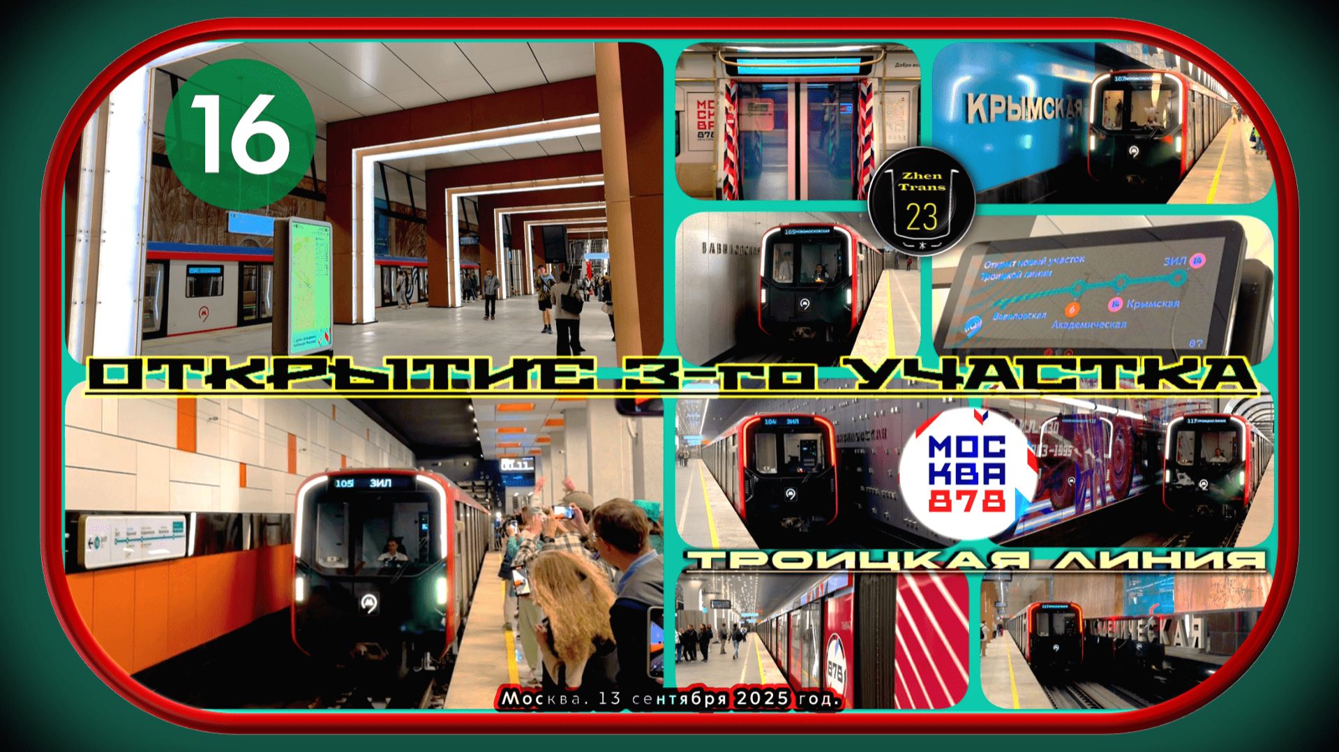 В этом видео я показал весь процесс открытия нового третьего участка Троицкой линии Московского метрополитена от станции «Новаторская» до стации «ЗИЛ». 13 сентября 2025 года были открыты станции «Вавиловская», «Академическая», «Крымская» и «ЗИЛ», протяжённостью почти 10 километров. Ожидается, что до 2030 года шестнадцатая линия дойдёт до Троицка. В настоящий момент проектируют ещё шесть станций: «Сосенки», «Летово», «Десна», «Кедровая», «Ватутинки» и «Троицк». Снято 13 сентября 2025 года. Поддержка моего канала - 2202 2023 6913 7413. Тайм-коды к видео: 00:00 – Начало. 00:25 – Станция «Новаторская» Троицкой линии. Ожидание прибытия первого метропоезда с пассажирами до станции «ЗИЛ». 07:00 – Мэр Москвы Сергей Собянин и Президент Российской Федерации Владимир Путин запускают новый участок Троицкой линии. 10:59 – Прибытие первого метропоезда «Москва-2024» до станции «ЗИЛ» (75345-75346). 12:50 – Подготовка к отправлению. 19:18 – Новаторская — Вавиловская. 22:55 – Вавиловская — Академическая. 26:23 – Академическая — Крымская. 29:52 – Крымская — ЗИЛ. 33:28 – Станция «ЗИЛ». Метропоезд «Москва-2024» отправляется в оборотные тупики. 34:30 – Первые минуты работы станции. 37:30 – Состав 75355-75356 едет в оборотные тупики. 39:21 – Состав 75453-75454 едет в оборотные тупики. 41:18 – Состав едет на Новомосковскую. 42:50 – Тематический состав 75443-75444 «Москве — 878 лет» едет в оборотные тупики. 44:25 – Тематический состав едет на Новомосковскую. 46:04 – Состав 75369-75370 едет на Новомосковскую. 47:50 – Состав 75341-75342 едет в оборотные тупики. 49:46 – Тематический состав 75447-75448 «Москве — 878 лет» едет в оборотные тупики. 51:37 – Тематический состав едет на Новомосковскую. 53:22 – Станция «Вавиловская». Состав 75367-75368 едет на ЗИЛ. 56:43 – Состав 75359-75360 едет на Новомосковскую. 58:40 – Состав 75373-75374 едет на ЗИЛ. 1:00:31 – Состав 75355-75356 едет на ЗИЛ. 1:02:08 – Состав 75363-75364 едет на Новомосковскую. 1:03:50 – Состав 75361-75362 едет на Новомосковскую. 1:05:22 – Тематический состав 75443-75444 «Москве — 878 лет» едет на ЗИЛ. 1:06:58 – Состав 75343-75344 едет на Новомосковскую. 1:08:54 – Тематический состав 75443-75444 «Москве — 878 лет» едет на Новомосковскую. 1:10:38 – Момент за кадром. 1:11:09 – Станция «Академическая». Состав 75349-75350 едет на ЗИЛ. 1:13:07 – Тематический состав 75443-75444 «Москве — 878 лет» едет на Новомосковскую. 1:15:07 – Состав 75343-75344 едет на ЗИЛ. 1:16:47 – Состав 75445-75446 едет на Новомосковскую. 1:18:38 – Состав 75351-75352 едет на Новомосковскую. 1:20:21 – Станция «Крымская». Состав 75449-75450 едет на ЗИЛ. 1:22:09 – Тематический состав 75443-75444 «Москве — 878 лет» едет на ЗИЛ. 1:23:37 – Состав 75345-75346 едет на Новомосковскую. 1:25:09 – Состав 75359-75360 едет на Новомосковскую и состав 75363-75364 едет на ЗИЛ. 1:27:54 – Состав 75361-75362 едет на ЗИЛ. 1:30:38 – Состав 75363-75364 едет на Новомосковскую. 1:31:54 – Состав 75355-75356 едет на ЗИЛ. 1:33:31 – Состав 75367-75368 едет на Новомосковскую. 1:35:13 – Состав 75373-75374 едет на Новомосковскую. 1:36:43 – Тематический состав 75443-75444 «Москве — 878 лет» едет на ЗИЛ. 1:38:36 – Состав 75449-75450 едет на Новомосковскую. 1:41:04 – Концовка. Музыка в видео: 1. «Epiphany» (Композитор «Trent Reznor» и «Atticus Ross», из фильма «Soul»). 2. «Merry-Go-Round of Life» (Композитор «Joe Hisaishi», из фильма «Howl's Moving Castle»). VK страница: https://vk.com/evgeniynaumov23 Telegram-канал: https://t.me/ZhenTrans23 Telegram-группа: https://t.me/zhentrans23chat Дзен: https://dzen.ru/zhentrans23 RUTUBE: https://rutube.ru/channel/23921395/ YouTube: https://www.youtube.com/@zhentrans23/videos