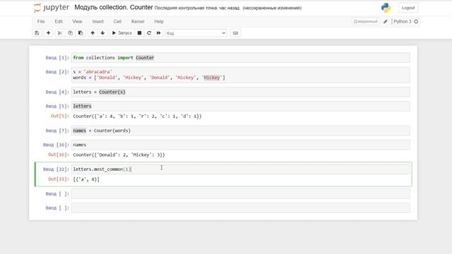 https://stepik.org/course/63085/promo Записывайся на мой курс на Stepic, где найдешь много практических задач Стать спонсором канала и получить доступ к дополнительным материалам по Python https://www.youtube.com/channel/UCMcC_43zGHttf9bY-xJOTwA/join https://boosty.to/egoroff_channel https://www.patreon.com/artem_egorov http://egoroffartem.pythonanywhere.com/course/python/spiski-i-operatsii-nad-nimi В этом видео мы поговорим о классе Counter стандартного модуля python Класс Counter позволяет посчитать количество вхождения каждого элемента переданной коллекции http://egoroffartem.pythonanywhere.com/course/python/12 Подробная информация об этом уроке Все видео этого курса можете найти на сайте http://egoroffartem.pythonanywhere.com/course/python или в Вк https://vk.com/videos-177962775?section=album_1 Если кому нужна помощь, предлагаю индивидуальные занятия. Подробнее пишите в личку в вк https://vk.com/artem_egoroff https://vk.com/python.study В данном группе можете найти информацию о новых видео и задать вопросы