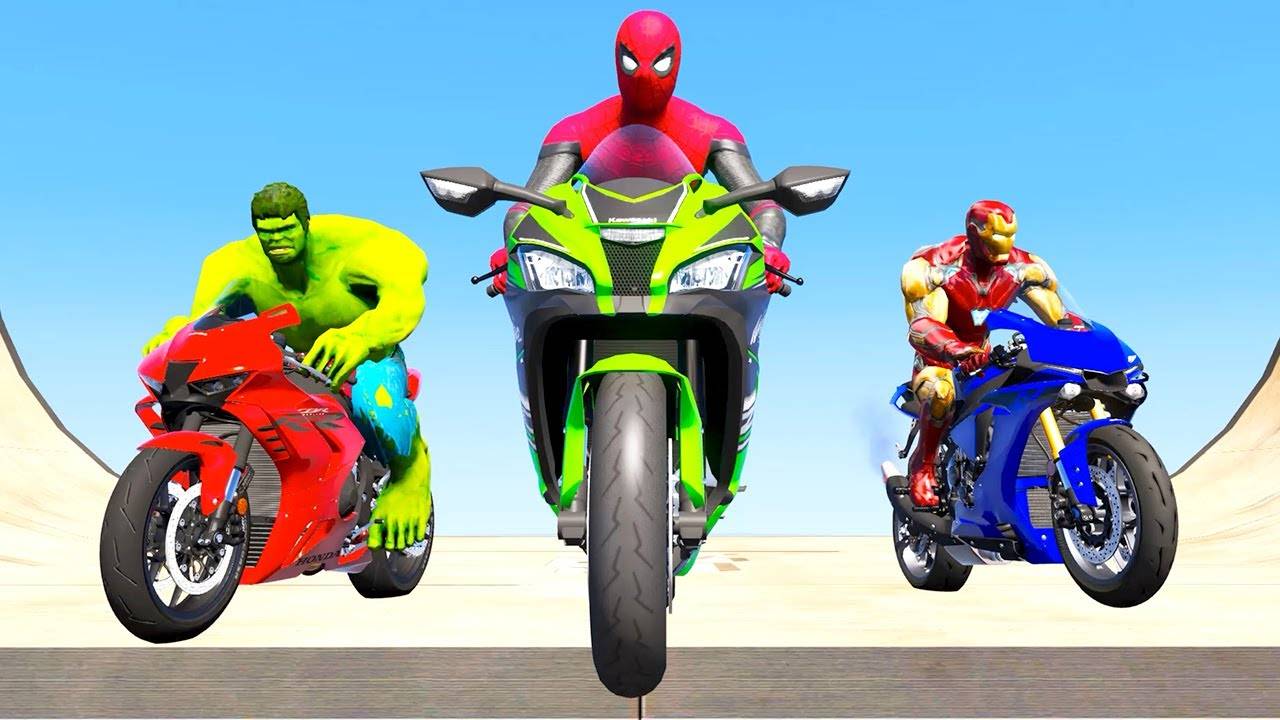 Гонка века на мотоциклах. Человек-паук против Халка и Железного Человека на спортивных мотоциклах!