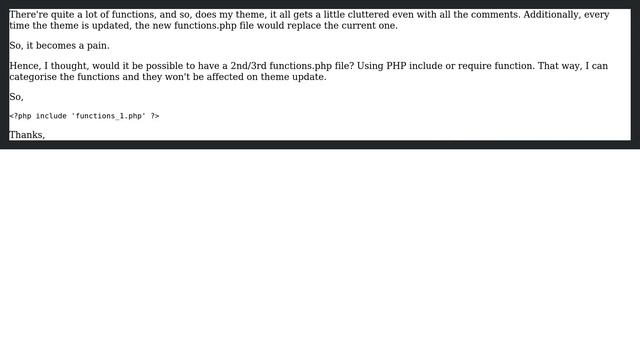 Wordpress: Can I have an additional functions.php file in Wordpress? Helpful? Please support me on Patreon: https://www.patreon.com/roelvandepaar With thanks & praise to God, and with thanks to the many people who have made this project possible! | Content (except music & images) licensed under CC BY-SA https://meta.stackexchange.com/help/licensing | Music: https://www.bensound.com/licensing | Images: https://stocksnap.io/license & others | With thanks to user obiPlabon (wordpress.stackexchange.com/users/135737), user Haneef Ibn Ahmad (wordpress.stackexchange.com/users/130791), and the Stack Exchange Network (wordpress.stackexchange.com/questions/293749). Trademarks are property of their respective owners. Disclaimer: All information is provided "AS IS" without warranty of any kind. You are responsible for your own actions. Please contact me if anything is amiss at Roel D.OT VandePaar A.T gmail.com