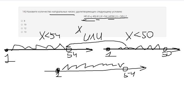 https://www.egoroffartem.ru/oge/task/2 На сайте размещены другие задания по этой теме https://www.egoroffartem.ru/oge/videotask/2 Список всех разборов 2 задания из ОГЭ по информатике: https://www.egoroffartem.ru/oge/videotask/ Видео решения задач по ОГЭ информатике https://vk.com/egoroff_channel_oge В данном группе можете найти информацию о новых видео и задать вопросы по ОГЭ Информатике Разбор задания № 2 ОГЭ ИНФОРМАТИКА Тема задачи "Логические выражения" Назовите количество натуральных чисел, удолетворяющих следующему условию НЕ (X меньше или равно 40) И ( (X меньше 54 ) ИЛИ ( X меньше 50) ) ?