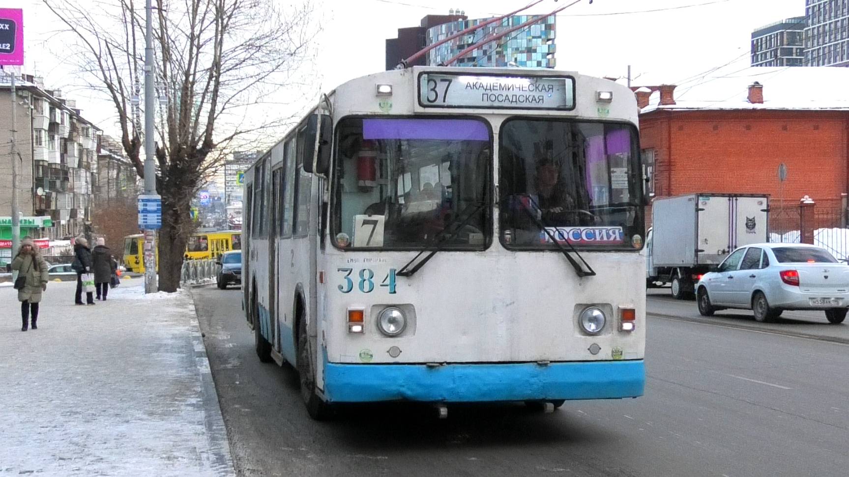 Троллейбус ЗиУ-682Г-016 (012) борт. №384 маршрут №37 "Академическая - Посадская" следует через остановку "ТЦ Алатырь". Город Екатеринбург, Россия. Приписка: Орджоникидзевское троллейбусное депо. 15.12.2022