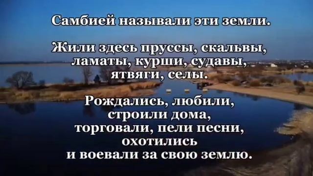 Самбией называли эти земли. Жили здесь пруссы, скальвы, ламаты, курши, судавы, ятвяги, селы. Рождались, любили, строили дома, торговали, пели песни, охотились и воевали за свою землю. Меня зовут Никльс, и я могу научить вас их языку. Semba bēi pabilītas šās zemmis. Buwinna stwi prūsai, skallawjai, kursjai, sūdawjai, jātawjai, sēlai. Gaminna si, milāi, zēidi buttans, kaupaūwa, grīmi grēmans, medjāi be karjaūwa per swajjan tāutan. As asma bilīts Nikls, be as mazzi izmakīntun jūmans tenēisan billan.