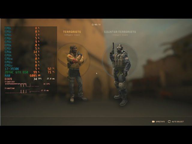 Game: Counter Strike Global Offensive Сomputer characteristics: Socket: LGA 2011 Motherboard: Asus Sabertooth X79 Processor: i7 3930K 3.20GHZ RAM: HYPER X 16GB DDR3-DIMM 1600 GPU: ZOTAC GTX 650 GDDR5 2GB ROM: SSD 128GB+HDD 500GB Video in 1920x1080 resolution. Operating system: Windows 10 Pro