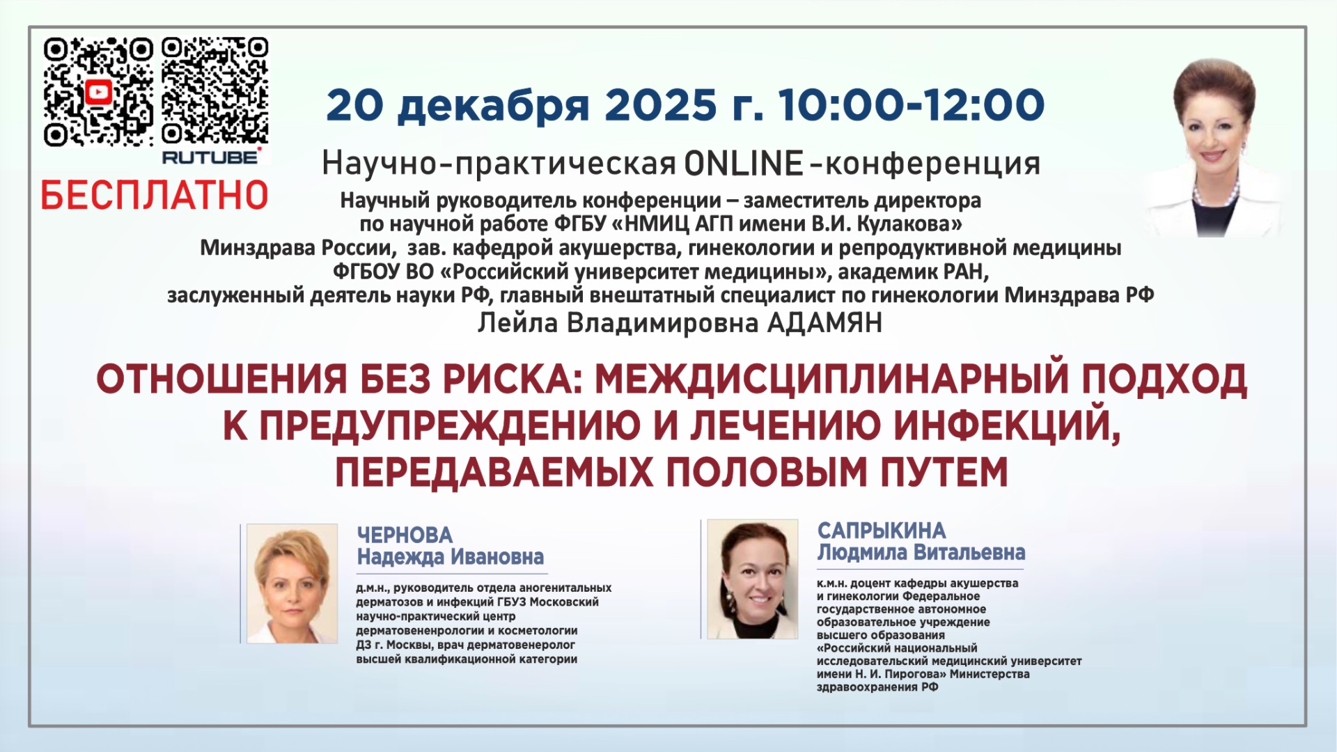Научно-практическая онлайн конференция: ОТНОШЕНИЯ БЕЗ РИСКА: МЕЖДИСЦИПЛИНАРНЫЙ ПОДХОД К ПРЕДУПРЕЖДЕНИЮ И ЛЕЧЕНИЮ ИНФЕКЦИЙ, ПЕРЕДАВАЕМЫХ ПОЛОВЫМ ПУТЕМ Инфекции, передающиеся половым путем (ИППП), являются серьезной угрозой здоровью нации, значтельно ухудшая репродуктивные возможности и общий уровень благополучия граждан. Решение проблемы ИППП невозможно без тесного междисциплинарного взаимодействия специалистов, таких как дерматовенерологи и гинекологи, чей профессиональный вклад обеспечивает эффективное выявление, диагностику и терапию. Совместная работа врачей различных специализаций необходима для выработки персонализированного подхода к лечению и реабилитации каждой пары, позволяя добиться стойкого выздоровления и длительной ремиссии. Только координированные усилия квалифицированных специалистов способны обеспечить эффективную профилактику и адекватное лечение ИППП, поддерживая высокий уровень репродуктивного здоровья населения и формируя здоровое будущее страны. ------------------------------------------------------------- НАУЧНЫЙ РУКОВОДИТЕЛЬ КОНФЕРЕНЦИИ: АДАМЯН Лейла Владимировна Заместитель директора ФГБУ «НМИЦ акушерства, гинекологии и перинатологии имени В.И. Кулакова» Минздрава России, зав. кафедрой репродуктивной медицины и хирургии ФГБОУ ВО «Российский университет медицины», академик РАН, заслуженный деятель науки РФ, главный внештатный специалист по гинекологии Минздрава РФ ------------------------------------------------------------- СПИКЕРЫ: ЧЕРНОВА Надежда Ивановна - д.м.н., руководитель отдела аногенитальных дерматозов и инфекций ГБУЗ Московский научно-практический центр дерматовененрологии и косметологии ДЗ г. Москвы, врач дерматовенеролог высшей квалификационной категории САПРЫКИНА Людмила Витальевна - к.м.н. доцент кафедры акушерства и гинекологии Федеральное государственное автономное образовательное учреждение высшего образования «Российский национальный исследовательский медицинский университет имени Н. И. Пирогова» Министерства здравоохранения РФ ------------------------------------------------------------- ПРОГРАММА КОНФЕРЕНЦИИ: 1) "ВЗГЛЯД ДЕРМАТОВЕНЕРОЛОГА. ПАРТНЕРСКИЕ ОТНОШЕНИЯ БЕЗ УГРОЗ ЗДОРОВЬЮ: ТАКТИКА ПРЕДУПРЕЖДЕНИЯ И ТЕРАПИИ ИППП" ( ЧЕРНОВА Надежда Ивановна ) 2) "ВЗГЛЯД ГИНЕКОЛОГА. ПЕРСОНАЛИЗИРОВАННЫЙ ПОДХОД К ВЕДЕНИЮ ЖЕНЩИН С ИППП" ( САПРЫКИНА Людмила Витальевна ) «Дискуссия. Ответы на вопросы» Адамян Л.В., Чернова Н.И., Сапрыкина Л.В.