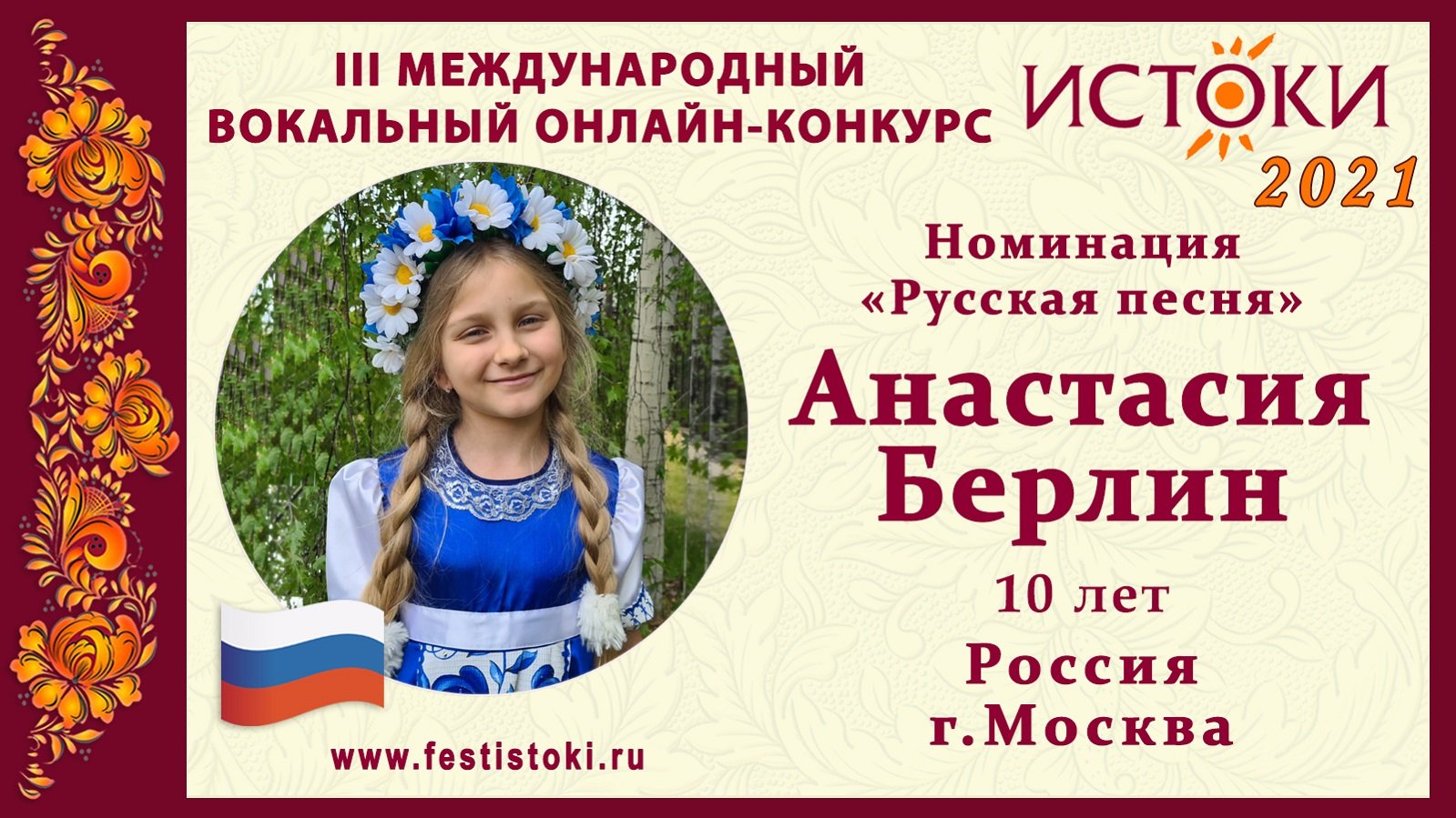Анастасия Берлин,10 лет. Россия, г. Москва. "Нет милей Руси"