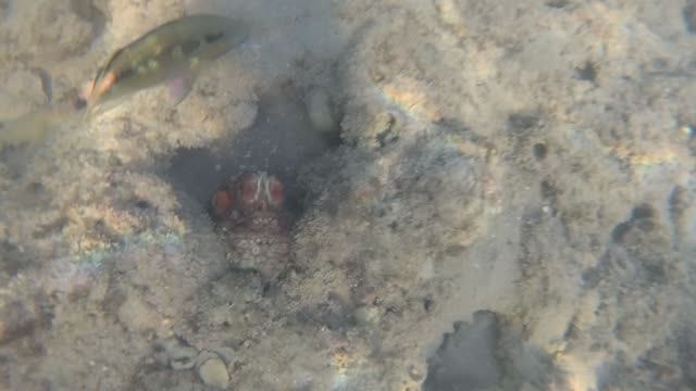 21 ноября 2025 года Египет, Шарм Эль Шейх Красное море , бухта Наама Бэй Осьминог красный - прячется и мимикрирует под цвет камней Талассома Клунцингера Хирург Аравийский