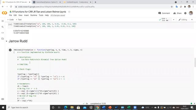 Please view code here: https://sites.google.com/view/vinegarhill-financelabs/binomial-lattice-framework/convergence-dynamics Please check colab: https://colab.research.google.com/drive/1UiY9DlZRtnQgFIJRFRQqhqEed6I2lKpg?usp=sharing We present functions for pricing American and European options with Tian, Jarrow Rudd and Cox Ross and Rubinstein using R code developed by Diethelm Wuertz, Tobias Setz and Yohan Chalabi for the fOptions R package. We also write a function for Leisen Reimer (1996) to complete standard binomial offering and follow the Espen Haug ij array.