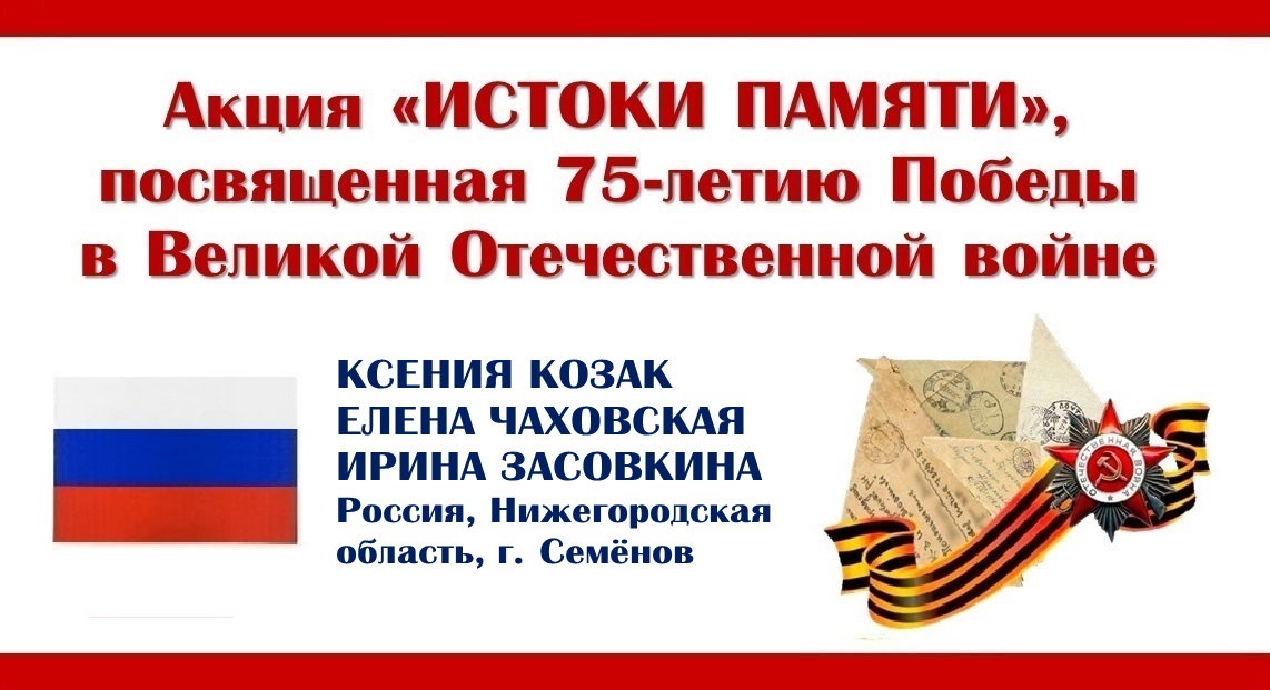 Акция «Истоки памяти» в честь 75-летия Победы. Поздравление от Ксении Козак, Елены Чаховской, Ирины Засовкиной (Россия, Нижегородская область, г. Семёнов). Участники, члены жюри и друзья Фестиваля «Истоки» поздравляют всех с Днём Победы! Мы благодарим всех участников акции из разных стран и городов за ваши открытые сердца и добрые слова, за сохранение Памяти! #ДеньПобеды #75летПобеды #БессмертныйПолк #мывместе #фестивальистоки #истокипамяти #истоки #соотечественники Сайт: www.festistoki.ru / www.festistoki.com E-mail: festistoki@mail.ru