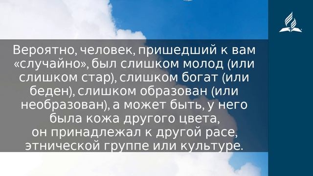 …Как Бог Духом Святым и силою помазал Иисуса из Назарета, и Он ходил, благотворя и исцеляя всех, обладаемых диаволом, потому что Бог был с Ним (Деян. 10:38). Давал ли Бог когда-нибудь кому-либо ваш адрес? Обратите внимание, что Святой Дух знал адреса людей в Иоппии (город близ современного Тель-Авива). Командиру римского полка в видении был дан точный адрес местонахождения Петра, который в то время жил в доме язычника в средиземноморском городе Кесарии и делился благой вестью об Иисусе с большим числом собирающихся там людей. Если бы Петр не услышал голоса Святого Духа, он не увидел бы в просьбе трех римлян, стоявших у двери, замечательную возможность нести Евангелие язычникам. Может быть, Бог дал кому-то и ваш домашний или рабочий адрес, и вам тоже свойственны некоторые предрассудки, мешающие рассказывать о могущественных делах Иисуса, совершенных посредством силы Святого Духа. Вероятно, человек, пришедший к вам «случайно», был слишком молод (или слишком стар), слишком богат (или беден), слишком образован (или необразован), а может быть, у него была кожа другого цвета, он принадлежал к другой расе, этнической группе или культуре. Нельзя сказать, что вы отвергли его или ее — вы просто не увидели в этом возможности. «Зачем этому человеку слушать меня?!» — может быть, подумали вы. Святой Дух знает точный адрес, где необходимо проповедовать Евангелие. Это адрес каждого человека, живущего на планете Земля. Как открыл Святой Дух Петру, «Бог нелицеприятен» (ст. 34). Петр объяснил эту истину словами о том, что Иисус «ходил, благотворя и исцеляя всех, обладаемых диаволом» (ст. 38). Часто в «адресе», который Бог дал кому-то, чтобы он или она встретились со мной и услышали о великом служении Иисуса, бывает указан автобус, самолет или поезд. Бог сводит нас вместе, а затем, уважая нашу свободную волю, дает возможность для благовествования. Святой Дух делает это, не принуждая. Он не ожидает и не хочет, чтобы мы навязывали что-то другому человеку. Он только просит нас подождать и быть внимательными к Его знаку, ведь именно Он избрал это время и это место, чтобы этот человек услышал о силе Иисуса, способной сокрушать сопротивление греха и зла. МОЛИТВА Господи, пожалуйста, помоги мне говорить Твои слова, когда я встречаюсь с людьми, которых Ты избрал, чтобы я послужил им сегодня. https://esd.adventist.org/library/periodicals/ezhednevnyie-chteniya/ #адвентисты #АдвентистыСедьмогоДня #Церковь #ЦерковьАдвентистовСедьмогоДня #ЦерковьХристианАдвентистовСедьмогоДня