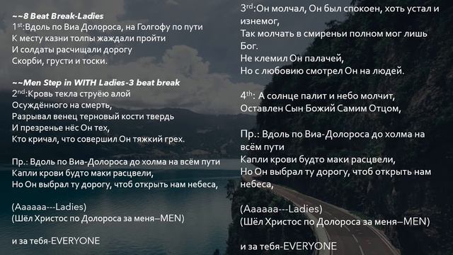 Вдоль по Виа Долороса, на Голгофу по пути К месту казни толпы жаждали пройти И солдаты расчищали дорогу Скорби, грусти и тоски. Кровь текла струёю алой Осуждённого на смерть, Разрывал венец терновый кости твердь И презренье нёс Он тех, Кто кричал, что совершил Он тяжкий грех. Пр.: Вдоль по Виа Долороса По страдания пути, Шёл Мессия, словно Агнец нас спасти. Но Он выбрал ту дорогу, чтоб открыть нам небеса, Шёл Христос по Долороса за тебя и за меня. Он молчал, Он был спокоен, Хоть устал и изнемог, Так молчать в смиреньи полном мог лишь Бог. Не клемил Он палачей, Но с любовию смотрел Он на людей. Припев. А солнце палит и небо молчит, Оставлен Сын Божий Самим Отцщм, Вдоль по Виа-Долороса до холма на всём пути Капли крови будто маки расцвели, Но Он выбрал ту дорогу, чтоб открыть нам небеса, Шёл Христос по Долороса за меня и за тебя