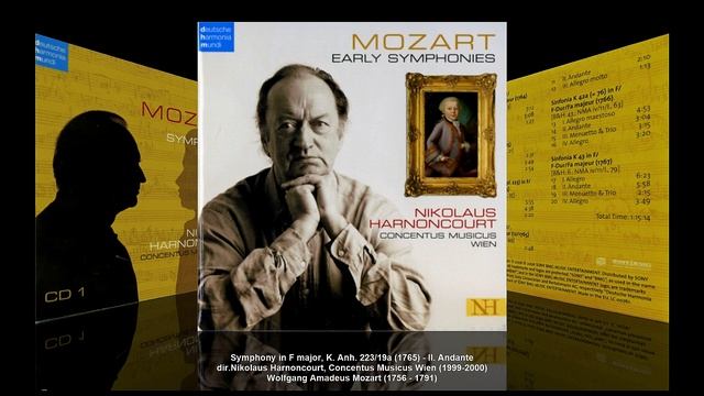 В.А. Моцарт. Все симфонии. Вып. 4a-1 Wolfgang Amadeus Mozart (1756 - 1791) – Symphony in F major, K. Anh. 223/19a (1765) Вольфганг Амадей Моцарт – Симфония фа мажор, K. Anh. 223/19a (1765) F-dur ■ en fa majeur ■ фа мажор I. Allegro 5:55 II. Andante 4:38 III. Presto 2:20 dir. Nikolaus Harnoncourt / дир. Николаус Арнонкур Concentus Musicus Wien / Австрийский инструментальный ансамбль старинной музыки 'Concentus Musicus Wien' Recorded December 1999 in Kasino Zögernitz, Wien, Austria Симфония фа мажор, К. Аnh. 223/19a, вероятно, была написана Вольфгангом Амадеем Моцартом в начале 1765 года в Лондоне. Симфония написана для двух гобоев, двух валторн и струнных. В оркестрах того времени также было принято включать фаготы и клавесин, если они были доступны в оркестре, чтобы усилить басовую партию и действовать как континуо. Гобои молчат во второй части. Продолжительность симфонии примерно 12-14 минут. Симфония состоит из следующих частей: 1. Allegro assai, 4/4 2. Andante, 2/4 3. Presto, 3/8 Симфония была утеряна, пока в 1980 году не была найдена копия в архиве Леопольда Моцарта. На титульном листе было написано, что она была создана, когда Вольфгангу было 9 лет, то есть в 1765 году. но эта дата неточна, поскольку Леопольд часто рекламировал своего сына моложе, чем на самом деле. До этого открытия были известны только инципиты* (incipits) из архива Breitkopf & Härtel на третьей странице обложки симфонии К.19 (Эта обложка ранее служила и для этой симфонии и для симфонии до мажор, К.19b, до сих пор не найденной). Симфония К.19a еще не была найдена, когда присваивались индексы K. или KV симфониям Моцарта. Симфония создана под сильным влиянием Иоганна Кристиана Баха. Гарольд Шёнберг отмечает, что симфония «не имеет индивидуальности» из-за очень юного возраста Моцарта на момент ее написания. * Инци́пит — начальные одно или несколько слов какого-либо текста, служащие для его идентификации, а также выполняющие функцию его названия (заголовка). Николаус Арнонкур (Nikolaus Harnoncourt, полное имя граф Иоганн Николаус де ла Фонтен и д’Арнонкур-Унферцагт, нем. Johann Nicolaus Graf de la Fontaine und d`Harnoncourt-Unverzagt; 6.12.1929, Берлин - 5.03.2016) — австрийский дирижёр и хормейстер, виолончелист, гамбист, музыковед, видный представитель движения аутентичного исполнительства. Выходец из аристократической и высокопоставленной семьи: его мать - внучка эрцгерцога Австрийского Иоганна Баптиста. Рос в Граце, учился музыке в Вене. Служил виолончелистом в Венском симфоническом оркестре (1952-1969). В 1953г. вместе с женой, скрипачкой Алисой Хоффельнер, создал барочный ансамбль «Concentus Musicus». Помимо руководства и дирижирования, играл в нём на виолончели и виоле да гамба. Дебютировал как оперный дирижёр в миланском театре Ла Скала («Возвращение Улисса на родину» Монтеверди, 1970). В 1971-1990 гг. вместе с Г.Леонхардтом записал все баховские кантаты. Работал с другими европейскими оркестрами, включая Консертгебау. Автор музыковедческих публикаций (русские переводы собраны в книге «Мои современники Бах, Моцарт, Монтеверди», М., 2005). По результатам опроса, проведённого в ноябре 2010г. британским журналом о классической музыке `BBC Music Magazine` среди ста дирижёров из разных стран, Арнонкур занял пятое место в списке из 20 наиболее выдающихся дирижёров всех времён. Введён в Зал славы журнала `Gramophone`. Жена - скрипачка Алиса Арнонкур. Дочь - флейтистка и оперная певица Элизабет фон Магнус.