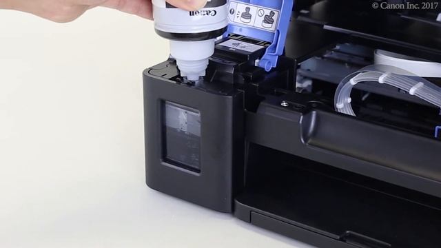 Remove the tank cap. Take out the ink bottle from the package. Pour ink in the ink tank. Close the scanning unit / cover.