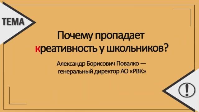 Разговорами о развитии в детях креативности, творческого мышления любят привлекать на свои занятия в системе допобразования. Но если уже государство в лице Сергея Владиленовича Кириенко в нашей недавней цитате говорит о креативных индустриях, то кто должен выращивать кадры? Герой видеоцитаты — Александр Борисович Повалко — генеральный директор АО «РВК», государственного фонда фондов и института развития венчурного рынка РФ говорит об исследовании ситуации, когда начальная школа формирует запас креативности в детях, а потом он пропадает. Какие гипотезы были высказаны участниками панельной дискуссии? Какие существуют решения данной проблемы? Ваши ответы на вопросы, возражения и свои варианты решений оставляйте под этим постом в нашей группе Вконтакте https://vk.com/tema_rema или Facebook https://www.facebook.com/groups/temarema Дополнительные материалы: - Материалы по теме «Творческое развитие детей»: https://vikent.ru/enc-list/category/232/ ; - Материалы по теме «Творческое развитие юношей и девушек»: https://vikent.ru/enc-list/category/233/ ; - Видео: Как развить амбиции у девочки | Индира Нуйи и Джина Райнхарт | 10 примеров, упражнений, приемов https://www.youtube.com/watch?v=r_JWDCykwGA&t=0s&ab_channel=POZNYAKOVAFORUM Использованные материалы: источник видео: - 21 10 2019 ЗАЛ ''КЕЙНС'' Платформы и технологии развития https://youtu.be/GT1LAGoUCgo #видеоцитата #креативность #комментарийэксперта #образование #школа #творчество #подростки