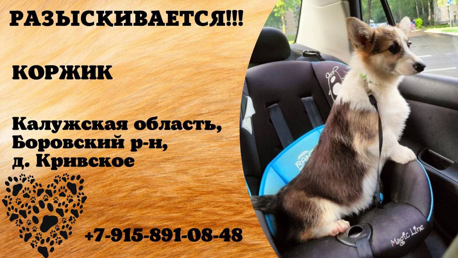 Калужская Боровский р-н, д. Кривское Пропала овчарка Здравствуйте, всё ещё ищем Коржика, убежал 28 августа в д. Кривское, нашедшему вознаграждение. Тел 89158910848 Инфо: https://vk.com/wall-198815410_151198 Автор: https://vk.com/id10843042