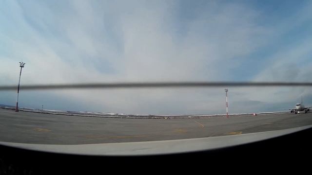 Первый рейс авиакомпании "Россия" на самолете Сухой Суперджет 100 в аэропорт Саратова "Гагарин" 28 марта 2021 года. Съемка велась с заднего сиденья автомобиля сопровождения Follow Me