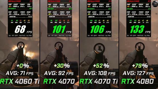 ✔ RTX 4060 Ti 8GB► https://geni.us/x2Ajd3 ✔ RTX 4070 12GB► https://geni.us/fbLqj ✔ RTX 4070 Ti 12GB► https://geni.us/KdUaH ✔ RTX 4080 16GB► https://geni.us/ZoZB ✔ Ryzen 9 5900X 5TH GEN 12c/24t ► https://geni.us/b0hQNk Thanks for watching & supporting me! ❗Affiliate Links❗ ✅All affiliate links have no additional costs for you✅ ? Testing System: • Windows 10 Pro ► https://bit.ly/3n2f81o • CPU ►Ryzen 9 5900X 5TH GEN 12c/24t ► https://geni.us/b0hQNk • CPU Cooler ► AIO MarsGaming ML-ONE360 Black ► https://geni.us/P21JiI • RAM ► Crucial RAM 32 GB (4x8) Dual Channel 3600 Mhz CL 16 ► https://geni.us/sRPNcO • Hard Disk ► Samsung SSD 970 Evo ► https://geni.us/zHOZb • Motherboard ► MSI X570 A Pro Gaming ► https://geni.us/xYuWe • Power Supply ► Gigabyte P850GM 850W ► https://geni.us/GYYIhB • Case ► Hyte Y60 Case Withe ►https://geni.us/ccF39q • Case Fans ► Miwatt RGB Series ► https://geni.us/PpAIGR • Monitor ► Samsung U28E590 4K ► https://geni.us/9QpvaYE • Gaming Keyboard ►Sharkoon Skiller SGK30 ► https://geni.us/ie96lI1 • Videocam ► Sony Vlog-Kamera ZV-1 ► https://geni.us/BBzK6k ?Cheap Games on Gamivo.com? https://gamivo.com?glv=aypv5u91 ✅GPU´s / Video Cards✅ ✔ RTX 2060 12 GB► https://geni.us/F1p3u ✔ RTX 2080 8GB► https://geni.us/duzPn ✔ RTX 3050 8 GB ► https://geni.us/mA4XsH3 ✔ RTX 3060 12GB► https://geni.us/RGgG ✔ RTX 3060 Ti 8GB► https://geni.us/K6u0Aw0 ✔ RTX 3060 Ti GDDR6X 8GB► https://geni.us/gxYNeR ✔ RTX 3070 8GB► https://geni.us/iCCnJ ✔ RTX 3070 Ti 8GB► https://geni.us/3UbnB6n ✔ RTX 3080 10GB► https://geni.us/Vtzq ✔ RTX 3080 Ti 12GB► https://geni.us/4LWfSb ✔ RTX 3090 24GB► https://geni.us/7NQ9MB ✔ RTX 3090 Ti 24GB► https://geni.us/J5ctwgD ✔ RTX 4060 Ti 8GB► https://geni.us/x2Ajd3 ✔ RTX 4070 12GB► https://geni.us/fbLqj ✔ RTX 4070 Ti 12GB► https://geni.us/KdUaH ✔ RTX 4080 16GB► https://geni.us/ZoZB ✔ RTX 4090 24GB► https://geni.us/yHOVcy ✔ RX 6600 8GB► https://geni.us/03G8ib ✔ RX 6600 XT 8GB► https://geni.us/PGeLH ✔ RX 6700 XT 12GB► https://geni.us/eZQJsFl ✔ RX 6800 16GB► https://geni.us/Tpfx5v3 ✔ RX 6800 XT 16GB► https://geni.us/UftC ✔ RX 6900 XT 16GB► https://geni.us/HfEG ✔ RX 6950 XT 16GB► https://geni.us/vKQj8mr ✔ RX 7900 XT 20GB►https://geni.us/NDfEkuO ✔ RX 7900 XTX 24GB► https://geni.us/FGq3L ✅CPU´s / Processors✅ ✔ Intel i5-11400F 11TH GEN 6c/12t ► https://geni.us/YfGFaew ✔ Intel i5-12400F 12TH GEN 6c/12t ► https://geni.us/so3FCt ✔ Intel i5 10600K 10TH GEN 6c/12t ► https://geni.us/GVGuCI ✔ Intel i5 11600K 11TH GEN 6c/12t ► https://geni.us/4wNpXP1 ✔ Intel i5 12600K 12TH GEN 10c/16t ► https://geni.us/LJYLT ✔ Intel i7 10700K 10TH GEN 8c/16t ► https://geni.us/Smtjc ✔ Intel i7 11700K 11TH GEN 8c/16t ► https://geni.us/ziW6pg ✔ Intel i7 12700K 12TH GEN 12c/20t ► https://geni.us/WqD6U ✔ Intel i9 10900K 10TH GEN 10c/20t https://geni.us/py8g ✔ Intel i9 11900K 11TH GEN 8c/16t ► https://geni.us/Ak4Saew ✔ Intel i9 12900K 12TH GEN 16c/24t ► https://geni.us/JEA8N ✔ Ryzen 5 5600X 5TH GEN 6c/12t ► https://geni.us/1wJKg ✔ Ryzen 7 5800X 5TH GEN 8c/16t ► https://geni.us/lqXb ✔ Ryzen 9 5900X 5TH GEN 12c/24t ► https://geni.us/b0hQNk 0:00 Dead Space 0:30 Star Wars Jedi Survivor 1:00 Dead Island 2 1:30 Redfall 2:00 Fortnite 2:30 Call of Duty Modern Warfare 2 3:00 The Witcher 3 3:30 Red Dead Redemption 2 4:00 Cyberpunk 2077 4:30 Total War Warhammer 3 Each benchmark run is repeated at least three times. The average value from all three runs is entered into the index. Jeder Benchmark-Durchlauf wird mindestens drei Mal wiederholt. In den Index eingetragen wird der Durchschnittswert aus allen drei Durchläufen. Каждый прогон бенчмарка повторяется не менее трех раз. В индекс вводится среднее значение по всем трем прогонам. RTX 4060 Ti RTX 4070 vs RTX 4070 Ti vs RTX 4080 // Test in 10 Games // 2K - 1440p // Benchmark