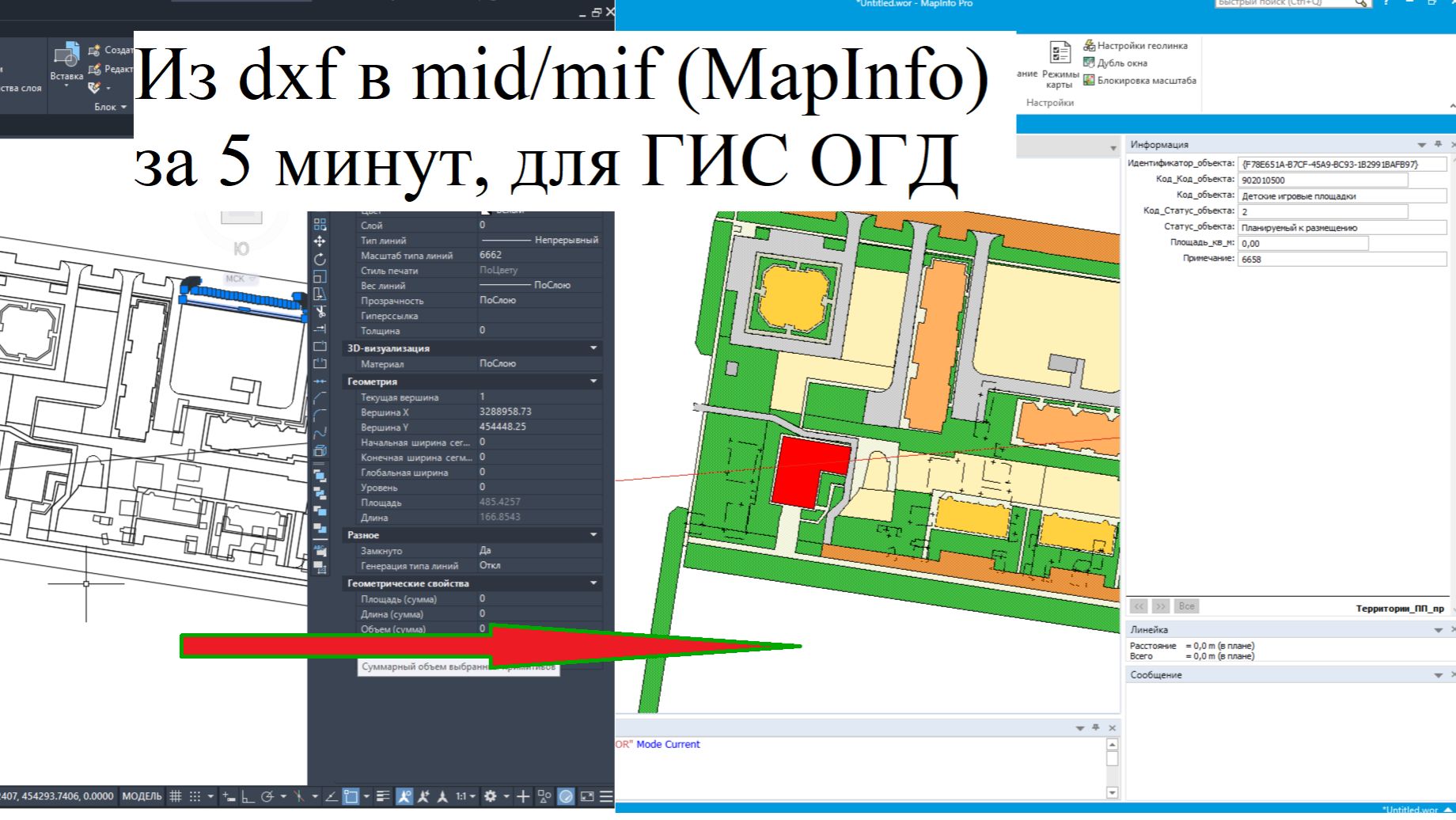 Коллеги, добрый день! Хотим представить вашему вниманию решение, которое позволяет кардинально сократить трудозатраты и исключить ошибки при подготовке материалов градостроительной документации для передачи в ГИС ОГД по строгим требованиям регионов. Суть проблемы: Разработанный в AutoCAD проект приходилось вручную приводить в соответствие с требованиями: переименовывать слои, назначать атрибуты и стили в MapInfo — долго, дорого и чревато ошибками. Наше решение: Я разработал программный конвертер, который автоматизирует этот процесс. Вам не важно, как названы слои в вашем DXF-файле или какие типы линий использованы. Как это работает: 1. Вы готовите чертеж в AutoCAD. 2. Экспортируете данные в стандартный DXF. 3. Наша программа анализирует DXF, сверяясь с приложенным классификатором (MIXML-файл Заказчика). 4. Ключевая особенность: программа интеллектуально распределяет объекты по слоям на основе кодов из классификатора, которые извлекаются из свойства Масштаб типа линии (LTSCALE) примитива в DXF. 5. На выходе вы получаете готовый комплект MIF/MID файлов, полностью соответствующих классификатору: o Корректные имена слоев. o Настроенная структура атрибутивных таблиц. o Графика, стилизованная согласно условным знакам. o Автоматически сгенерированные GUID-идентификаторы для каждого объекта. o Корректная кириллическая кодировка (CP1251).