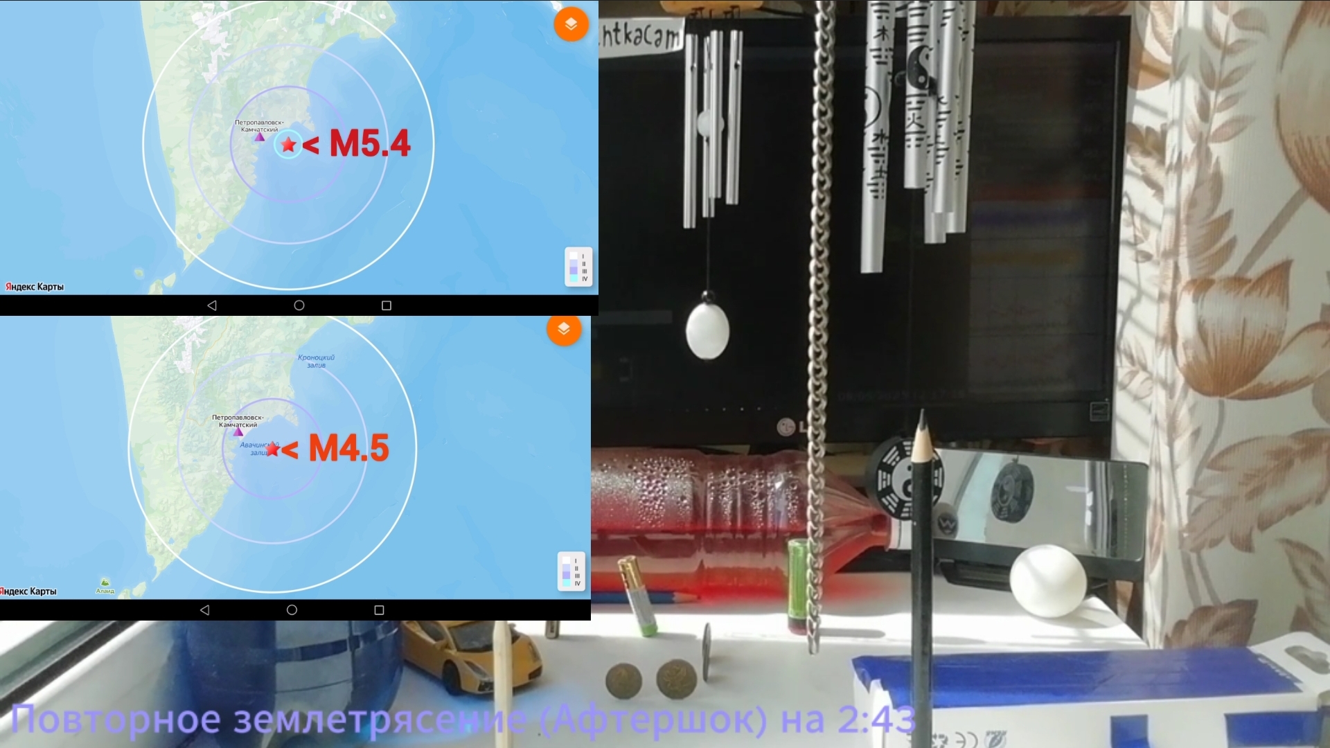 Землетрясение (М5.4) + Афтершок (М4.5) Эпицентры были в 75 км от г Петропавловск-Камчатский
