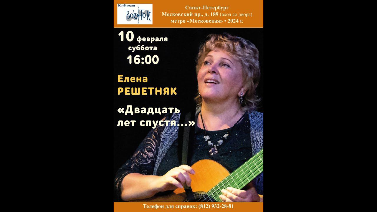 Елена Решетняк при участии Сергея Евсюткина. «Двадцать лет спустя...». Клуб песни «Восток». Ведущая - Алла Левитан. Санкт-Петербург, Московский пр., д. 189. Видеозапись - Алла Левитан. Запись звука - Геннадий Демин. Афиша - Елена Адрианова. 10 февраля 2024 г.