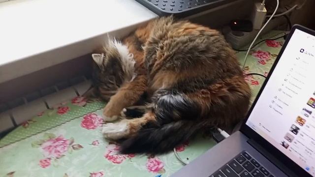 Муся греется на батарее