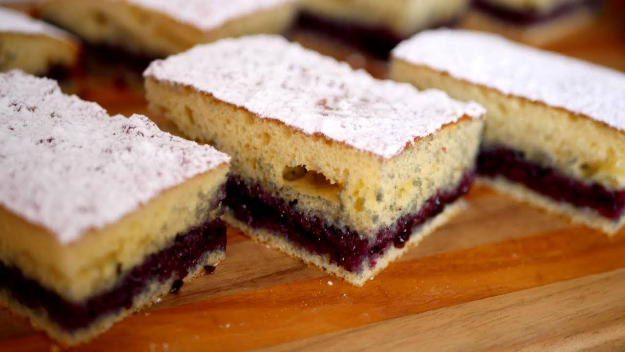Ингредиенты (форма 24х24 см.): 1 стакан кефира (200 мл); 250 грамм муки(1,5 стакана); 2 яйца; 1 ч.л. соды; 200 грамм сахара (1 стакан); варенье или джем.