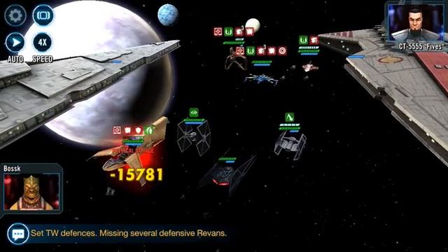 Beating the Nest ship node and getting 3 stars. (No Audio) Capital Ship: Tarkin Initial Line Up: Hound's Tooth, Tie Silencer, Imperial TIE Fighter Reinforcements (in order): Tie Advanced x1, Slave I
