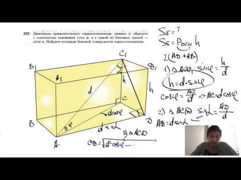 №232. Диагональ прямоугольного параллелепипеда, равная d, образует с плоскостью основания угол φ, а с меньшей боковой гранью — угол α. Найдите площадь боковой поверхности параллелепипеда. Поддержать канал рублём - 5469400944002125 (Сбербанк) Мой второй канал для подготовки к ЕГЭ и ОГЭ - https://www.youtube.com/ЕвгенийСумин Инстаграм - https://www.instagram.com/EGE_OGE.math Личный инстаграм - https://www.instagram.com/ee_sumin VK - https://vk.com/evgeniysumin FB - https://www.facebook.com/EvgeniySumin