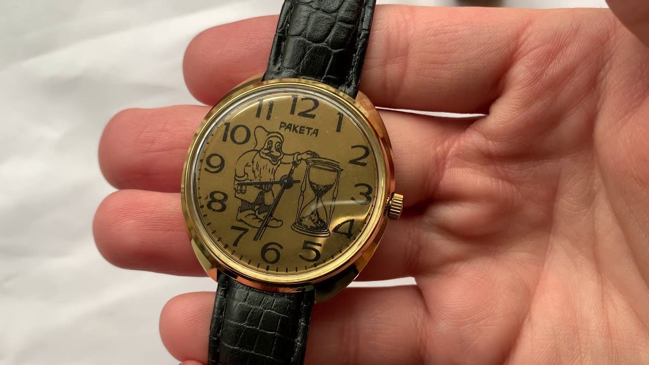 Видеообзор на необычные редкие часы «Ракета» с зеркальным циферблатом и гномом из Белоснежки Петродворцового Часового Завода.
