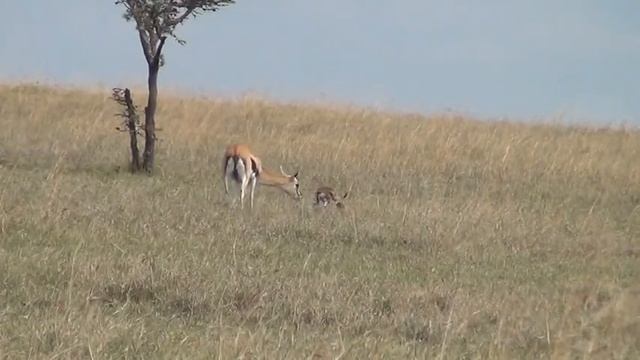 The fawn is less than 20 minutes old at the beginning of the video. In the hour or so after birth the mother must clean the fawn and the fawn must learn to stand, walk, and suckle. Once these tasks are complete, the fawn will hide in the grass for long periods of time while its mother grazes, until its mother retrieves it. This hiding behavior will persist for up to two months. The hour after birth is very risky for the fawn because until it begins hiding it is very conspicuous and vulnerable to predators. This mother and fawn suffer several interferences by other gazelle - a hazard of giving birth within a herd. To learn more about gazelle birth and the vulnerable postpartum period and to read my scientific paper on the topic, please visit goo.gl/ASBAHW. Filmed at Ol Pejeta Conservancy, Kenya. August 16, 2012.