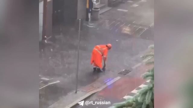 Лужу пытаются прогнать с московских улиц в водосток