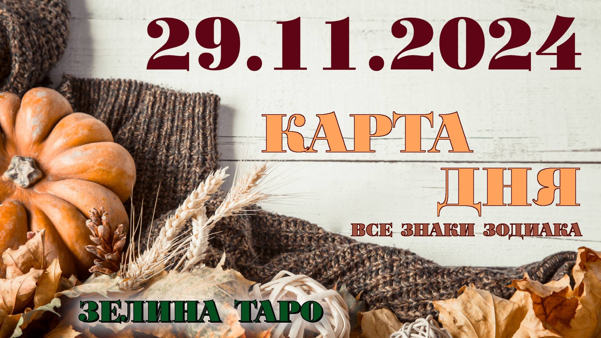 Таро прогноз (карта дня и совет) на 29 ноября 2024 года для знаков зодиака. Таро онлайн к вашим услугам. ************************************************** Мой канал на Дзен про политику: https://dzen.ru/profile/editor/zelinataropolit ************************************************** Дисклеймер. Автор канала работает по системе Таро, которая предполагает прямые и перевернутые карты. Автор в своем уме и умеет складывать карты вверх головой, а не ногами. Если вам не нравятся перевернутые карты, смотрите других тарологов, их великое множество в интернете. Уважайте авторов, которые работают для вас. Если прогноз негативный, просто не принимайте близко к сердцу. И помните, что вы сами творец своей судьбы. Всем отличного настроения и удачи! Всем, кто смотрит меня, огромная благодарность! ************************************************** Тайм-коды: Вступление 00:00 Овен 00:12 Телец 02:43 Близнецы 05:18 Рак 08:01 Лев 12:18 Дева 14:31 Весы 16:18 Скорпион 19:04 Змееносец 21:34(30 ноября - 17 декабря) Стрелец 24:32 Козерог 27:04 Водолей 29:47 Рыбы 32:48 ************************************************** Дорогие подписчики, зрители и гости канала! БЛАГОДАРЮ ВАС за приятные КОММЕНТАРИИ, ПОЖЕЛАНИЯ, ЛАЙКИ, ПРОСМОТРЫ, ПОДПИСКИ и ДОНАТЫ! ************************************************** Если вы хотите поблагодарить меня за мой ТРУД, вы можете это сделать с помощью ДОНАТОВ. Большое Спасибо! СБЕРБАНК России - 5469 5200 2341 6795 (Ольга Викторовна М.) (В ОПИСАНИИ ПЛАТЕЖА НАПИШИТЕ - "ПОДАРОК". БЛАГОДАРЮ ВАС!) ************************************************** Расклад можно смотреть как по солнечному знаку зодиака, так и по асценденту и даже по вашему лунному знаку, то есть знаку, в котором была луна в момент вашего рождения. ************************************************** Мой канал в Telegram https://t.me/zelinataro Сообщество в ВК https://vk.com/zelinataro Telegram +79185274185 ************************************************** Картинка взята отсюда: https://www.freepik.com/free-photo/autumn-wall-with-decorative-items-pumpkin_10376169.htm #Зелинатаро #таро #тароонлайн #тарорасклад #гаданиетаро #гадание #раскладтаро #гаданиеонлайн #таросегодня #отношения #магия #гаданиенакартах #картытаро #таропрогноз #карта дня