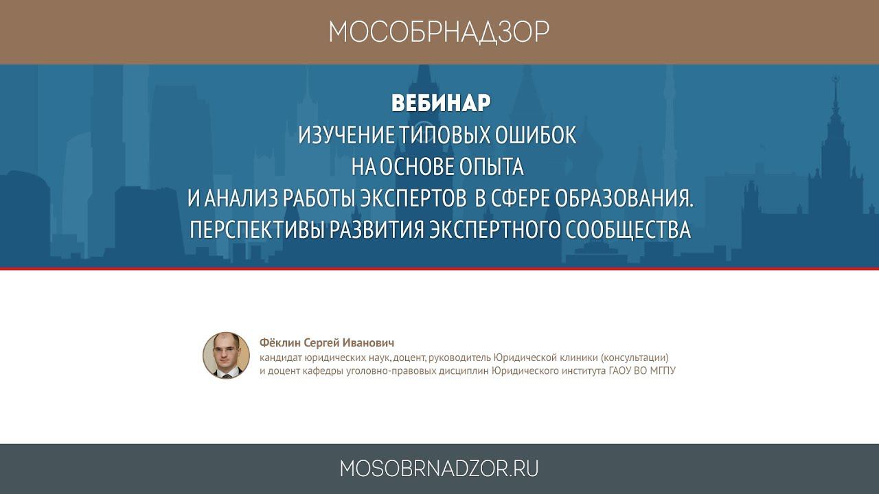 Вебинар «Изучение типовых ошибок на основе опыта и анализ работы экспертов в сфере образования, перспективы развития экспертного сообщества » был проведен в рамках проекта Мособрнадзор.РФ 16 октября 2017 года. Ведущий вебинара - Феклин С.И. Страница вебинара на сайте проекта - http://mosobrnadzor.ru/supervision/webinars/2017-11-16_15-00