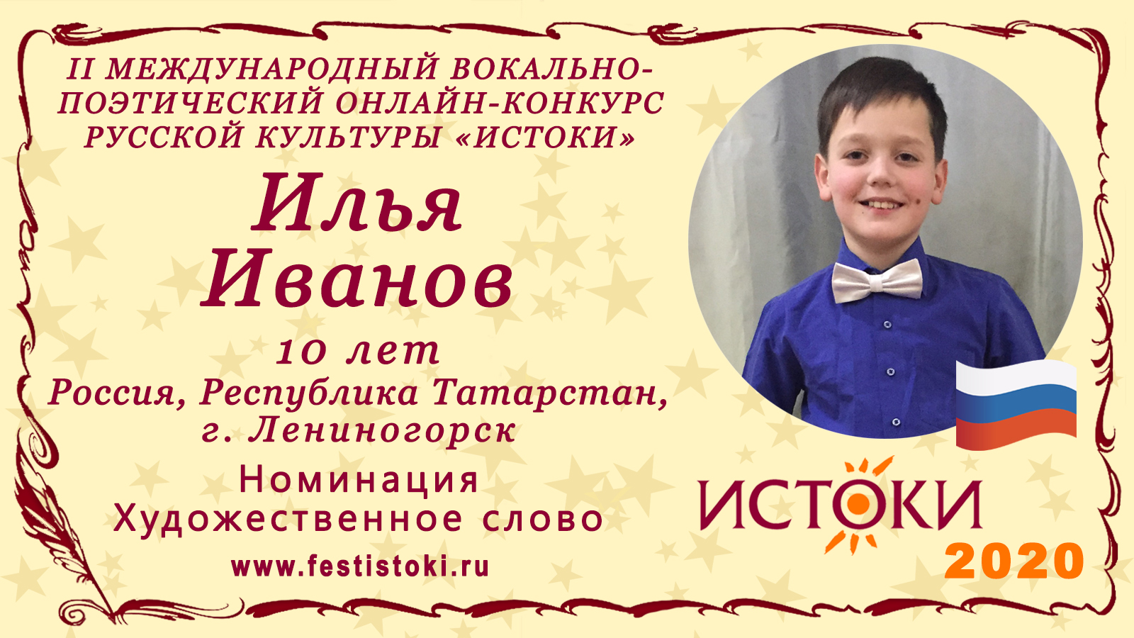 Лауреат I степени II Международного вокально-поэтического онлайн-конкурса русской культуры «Истоки». Номинация - Художественное слово. Отрывок из "Сказка о попе и работнике его Балде”. Автор Александр Сергеевич Пушкин. Сайт: www.festistoki.ru / www.festistoki.com E-mail: festistoki@mail.ru