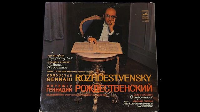 Третья часть — Romanza Andante — отмечена тонким изяществом и теплой лирикой. В основу положена тема незавершенного романса М. А. Балакирева на стихи М, Лермонтова „Склонись ко мне..." Вслед за первой темой следует вторая, звучащая у флейты и английского рожка на фоне равномерного колышущегося аккомпанемента струнных. Четвертая часть — Полонез. Tempo di Polacca — начинается c торжественного, фанфарного вступления труб. Первая тема — упругая, c изысканным ритмическим рисунком подводит к мелодии русской народной песни „Как у нас в садочке". Ненадолго возникает видоизмененная мелодия Романса, которая ведет к плясовой теме, звучащей в финале Симфонии с подлинно русской удалью и силой. „Торжественное шествие“ (соль мажор) А: К. Глазунова, созданное в 1907 году, не случайно объединено на этой грампластинке со Второй симфонией М. А, Балакирева. Один из учеников Балакирева, Глазунов был продолжателем дела крупнейшего русского композитора. Общение с ним помогло А. К. Глазунову открыть чудесный мир музыкальных образов М.И. Глинки, А.П. Бородина, Н.А. Римского-Корсакова. „Торжественное шествие" написано в лучших традициях русской композиторской школы. В произведении использована русская народная попевка, интонации которой близки музыкальному языку Глинки и Римского-Корсакова. Произведение, красочно инструментовано. Многолетняя работа на радио и в Большом театре СССР, широкая концертная деятельность, частые гастрольные выступления за рубежом, наконец, огромное число записей, среди которых и удостоенные международных премий, принести дирижеру Геннадию Рождественскому признание и популярность во всем мире. Народный артист СССР, лауреат Ленинской премии Геннадий Николаевич Рождественский родился в Москве в 1931 году. По окончании Центральной музыкальной школы он поступает в Московскую консерваторию, где занимается по классу фортепиано у Л.Н. Оборина и классу дирижирования у своего отца Н.П. Аносова. В 1951 году еще студентом консерватории Рождественский начал стажировку в Большом театре и в том же году блистательно прошел его дирижерский дебют в балете „Спящая красавица" Чайковского, В 1954 году, уже будучи дирижером Большого театра, Рождественский окончил консерваторию. На протяжении 19 лет (с небольшим перерывом) Геннадий Рождественский дирижировал спектаклями Большого театра, а с 1965 по 1970 год был его главным дирижером. С 1961 по 1974 год Г.Н. Рождественский возглавлял Большой симфонический оркестр Центрального телевидения и Всесоюзного радио. В 1974 году Г. Рождественский становится музыкальным руководителем: Московского камерного музыкального театра и с 1978 года одновременно дирижером Большого театра СССР.