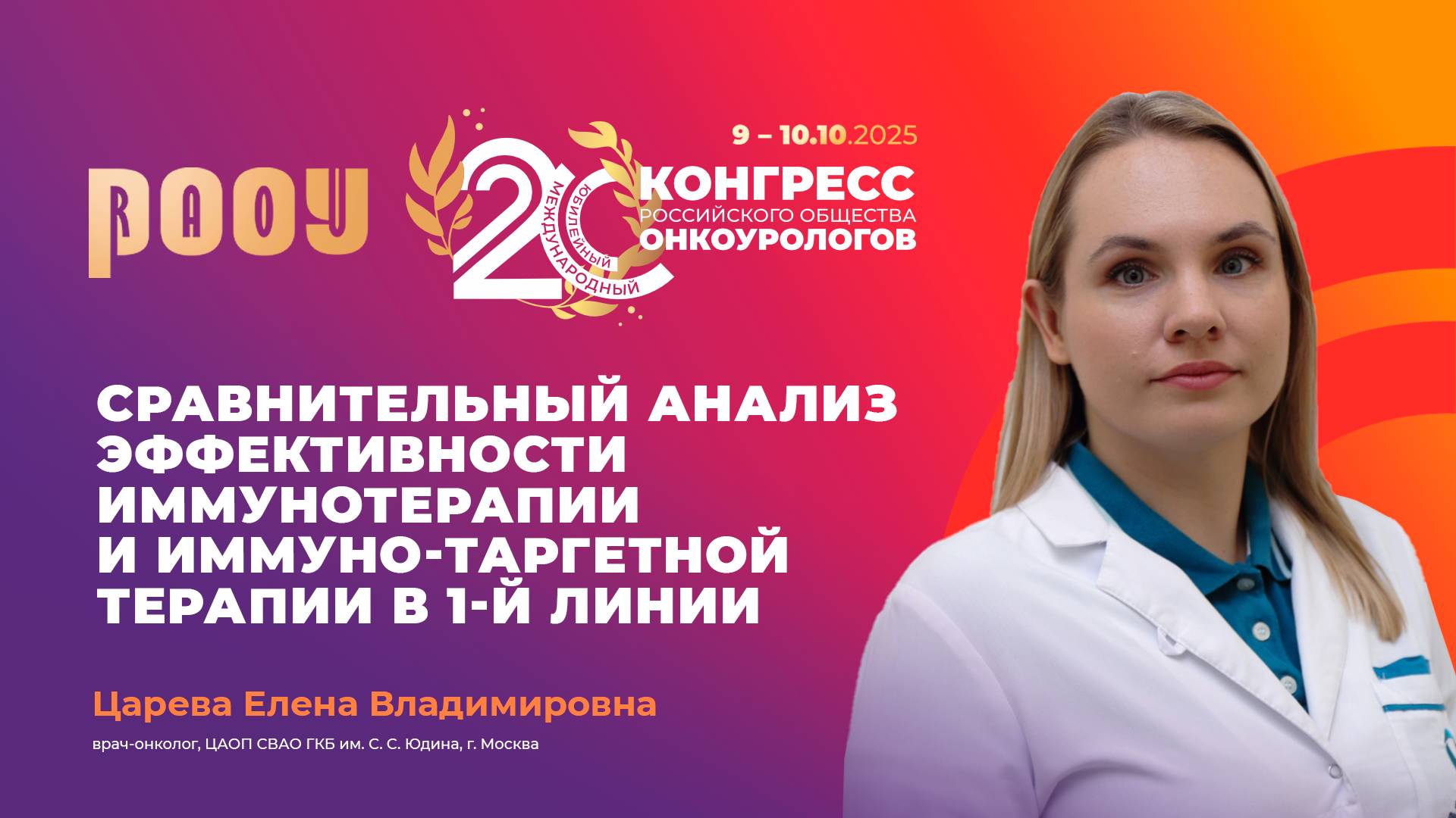 9 октября на XX Международном Конгрессе РООУ Царева Елена Владимировна представила доклад на тему: "Сравнительный анализ эффективности иммунотерапии и иммуно-таргетной терапии в 1-й линии лечения метастатического почечно-клеточного рака". ✅ Эксперт: Царева Елена Владимировна, врач-онколог, ЦАОП СВАО ГКБ им. С. С. Юдина, г. Москва. ➡️ Официальный сайт РООУ: https://roou.ru/ Присоединяйтесь к нам в социальных сетях. Делитесь мнением и повышайте уровень теоретической и практической подготовки в онкоурологии: Telegram: https://t.me/oncologyurology ВКонтакте: https://vk.com/oncologyurology #РООУ #RAOU #ОбществоОнкоурологов #Онкоурология #Урология #Онкология #Oncourology #XVКонгрессРООУ #КонгрессРООУ #ракпочки #медицинскиеконференции #urology