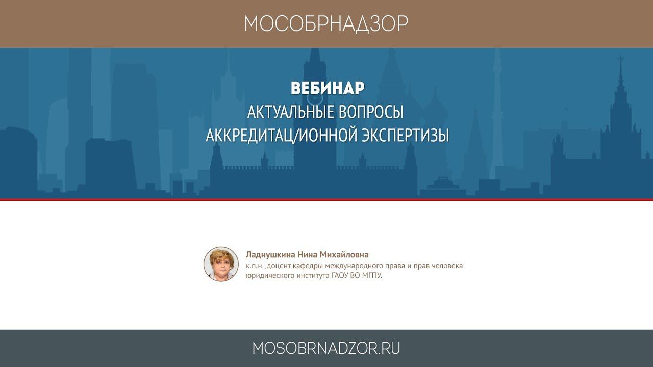 Вебинар «Актуальные вопросы аккредитационной экспертизы» был проведен в рамках проекта Мособрнадзор.РФ 26 февраля 2019 года. Ведущая вебинара - Ладнушкина Н.М. Страница вебинара на сайте проекта - http://mosobrnadzor.ru/accreditation/webinars/2019-02-26_15-00
