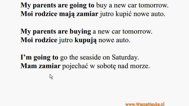 Wyrażanie przyszłości za pomocą czasu Present Continuous oraz frazy TO BE GOING TO. w przyszłym roku - next year lecieć - to fly spędzać - to spend wakacje - holiday nad jeziorem - at the lake w piątek - on Friday odwiedzać - to visit babcia - grandmother brat - brother wracać - to come back z Niemiec - from Germany w niedzielę - on Sunday szczotka do włosów - brush w czwartek - on Thursday z - with iść na ryby - go fishing