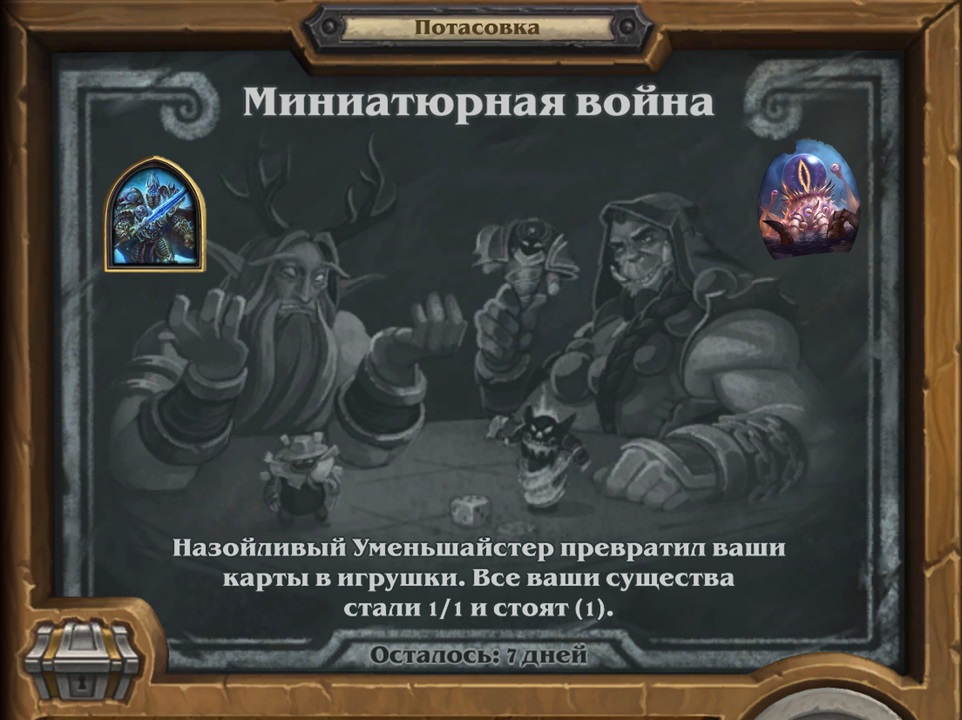 Потасовка в Hearthstone, в период с 04.01.2023 - 11.01.2023 Потасовка: Миниатюрная война Дедушка Назойливый Уменьшайстер превратил ваши карты в игрушки. Все ваши существа стали 1/1 и стоят (1).