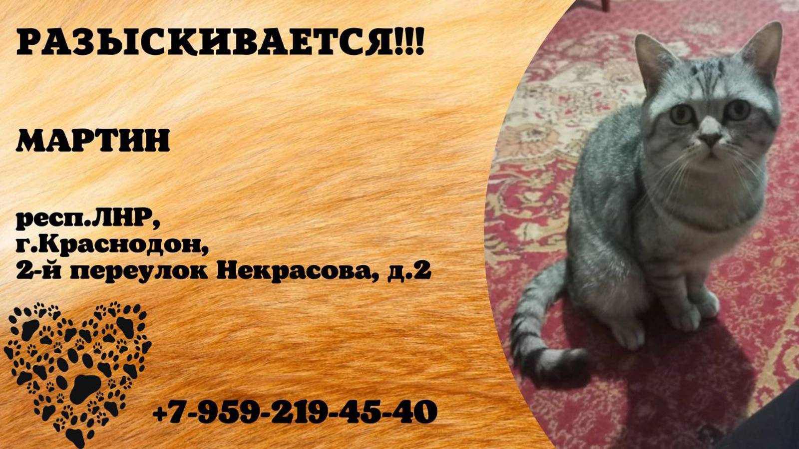 Пропал кот! МАРТИН. респ.ЛНР, г.Краснодон.