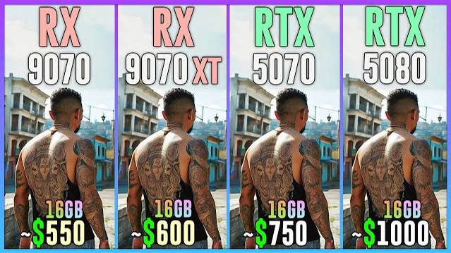 RX 9070 vs RX 9070 XT vs RTX 5070 vs RTX 5080 - Test in 25 Games 2025 1080p, 1440p, 2160p, 4k, 2k, dlss 4, dlss 3.7, fsr 4, fsr 3.1, ray tracing, frame generation, native, Multi Frame Generation ⏩GPUs & Amazon US⏪ (Affiliate links) 💥RX 9070 16GB: https://amzn.to/4i1WalR 💥RX 9070 XT 16GB: https://amzn.to/4bxyEKX 💥RTX 5070 12GB: https://amzn.to/41sJCN 💥RTX 5080 16GB: https://amzn.to/4jyqKER ⏩PC Setup⏪ - OS: Windows 11 Professional 64-bit - CPU: Ryzen 7 9800X3D - MB: GIGABYTE X870 AORUS Elite - RAM: Corsair Vengeance RGB 32GB DDR5 - 6400 Mhz CL32 💁♂️ When you buy from my Amazon links, I earn a small commission at no extra cost to you, plus you support the channel thank you.