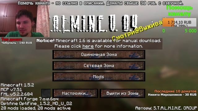 Помочь каналу можно здесь: http://www.donationalerts.ru/r/zziwiling Донаты свыше 30 рублей - с озвучкой S.T.A.L.M.I.N.E. v 0.4.5 - Комплексный мод, переносящий мир Сталкера в Minecraft. И сегодня в Зону отправится не кто иной, как Аксал. ССЫЛКА НА СКАЧИВАНИЕ ИГРЫ В ОПИСАНИИ. Автор мода: Erked+ ещё кто-то. Авторы патча v.0.4.5. : McModder, Axul7, Zziwiling, DarkGrim, BinaryZ, AlexStraga Актуальная версия v.0.4.5.: https://yadi.sk/d/HemRRTYUmXGF7 ________________________________________________________________ Скачать устаревшую версию v.0.4 для синглплеера можно по ссылке: https://yadi.sk/d/c8mT-dAYZ9Ky6 Скачать патч от McModder для установки собственных скинов на устаревшую версию https://yadi.sk/d/1zrAUWRfmGTCj Опытные кубические сталкеры, пишите свои советы в комментариях! Группа McModder-а https://vk.com/tlauncher Канал DarkGrim-а https://www.youtube.com/user/SuperDarkGrim Я Вконтакте http://vk.com/axulmrakzziwiling Группа Вконтакте http://vk.com/public49837885