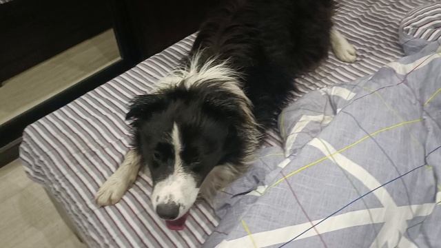 Грязный Бордер Колли пришёл сушить шкуру в спальню)))