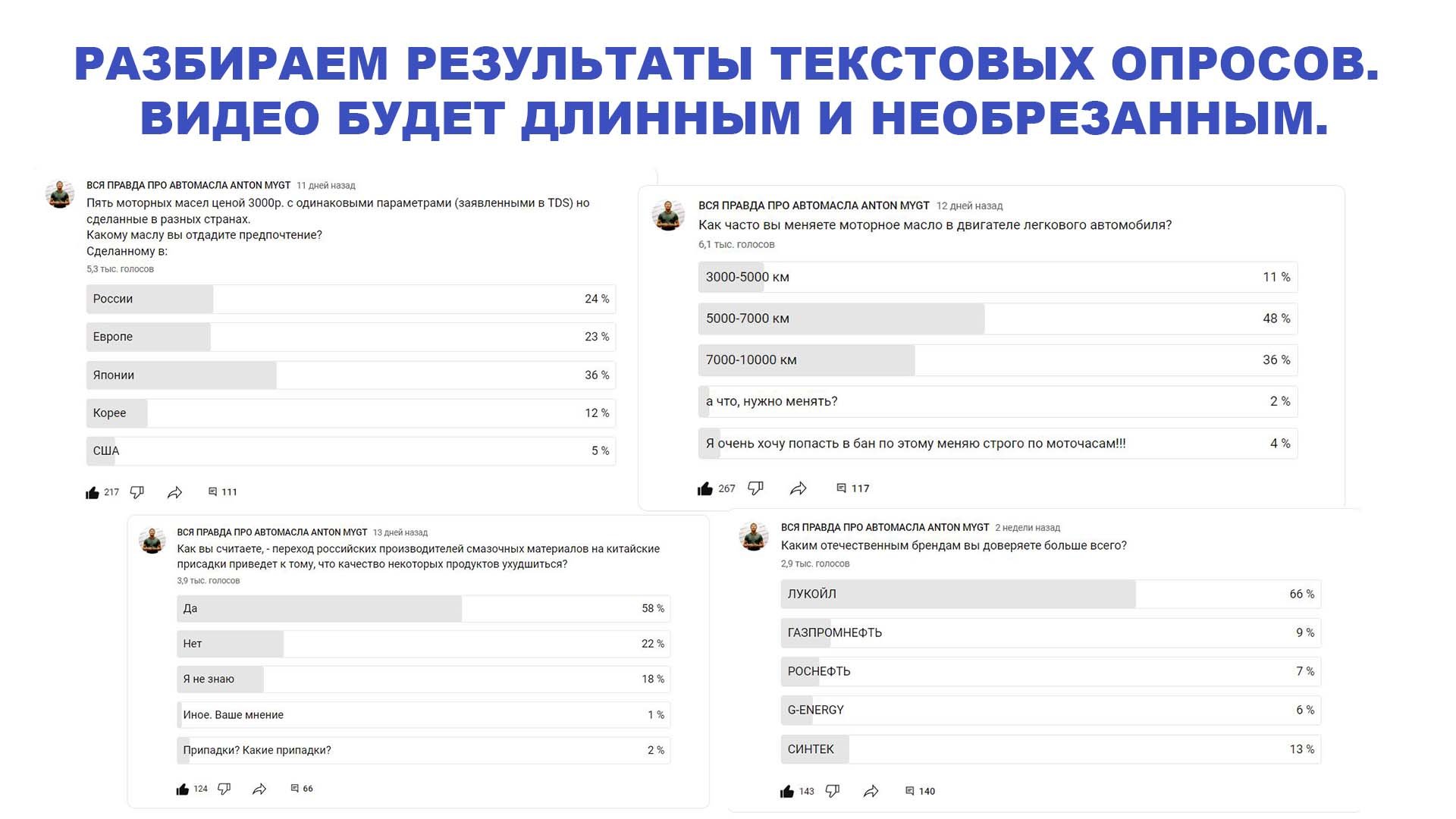 Ссылки на вкладку сообщество: https://www.youtube.com/@MYGT/community Какие темы мы разбираем в этом видео: 1. Каким отечественным брендам вы доверяете больше всего? 2. Как часто вы меняете моторное масло в двигателе легкового автомобиля? 3. Пять моторных масел ценой 3000р. с одинаковыми параметрами (заявленными в TDS) но сделанные в разных странах. Какому маслу вы отдадите предпочтение? Сделанному в: 4. Как вы считаете, - переход российских производителей смазочных материалов на китайские присадки приведет к тому, что качество некоторых продуктов ухудшиться? НАШИ КОНТАКТЫ: Звоните 8800-550-5722 пн-пт 9.00-17.00 разницу во времени. Мы находимся в Новосибирске по адресу Николая Островского, 111 к5319 офис; 3 этаж Дополнительные номера: +79237754997 +79237751551 +79139155112 Обязательно подпишитесь на нас на ДЗЕН - это важно! https://dzen.ru/mygt Вот наш сайт: https://mygt.ru/oil/ ВНИМАНИЕ!!!! На ozon и wildberries представлен ОЧЕНЬ ограниченный выбор наших продуктов. Всё остальное есть у нас на сайте. Отправляем по России ЛЮБОЙ ТК. По вопросам наличия обращайтесь по вышеуказанным номерам. Вот наши официальные магазины на ozon ИП ВОРОНКОВ https://www.ozon.ru/seller/ip-voronkov-829866/products/ Вот наш официальный магазин на wildberries MYGT https://www.wildberries.ru/seller/1163651