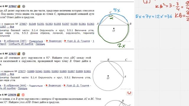 Фулл:https://youtu.be/1xoXmCf3R5c Соц.Сети: Я Вконтакте | https://vk.com/d_lebedev0 Тут тоже я | https://www.instagram.com/d_lebedddev/ Группа ВК | https://vk.com/public184406280 Занятие со мной | http://данилебедев.рф/ Для тех,кто хочет поддержать мои разборы Сбербанк: 4274320030758794 QIWI:+79122855863 Задание 6 №27867 Хорда AB делит окружность на две части, градусные величины которых относятся как 5:7. Под каким углом видна эта хорда из точки C, принадлежащей меньшей дуге окружности? Ответ дайте в градусах.