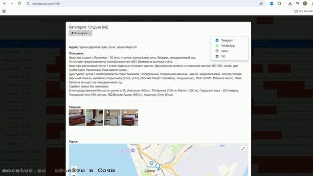 Видеоинструкция по работе в системе онлайн-бронирования МореТур Агент--- Перед нами непосредственно сама шахматка системы бронирования МореТур Агент--- Подробности о работе в ней будут рассказаны позже--- Изначально вы заходите на главную страницу нашего сайта moritur---su, опускаетесь вниз и читаете информацию о работе системы бронирования МореТур--- Если вы представляете агентство или профсоюзную организацию, нажмите кнопку для агентства--- После этого вы попадёте на страницу самой системы бронирования, где предлагается пройти регистрацию--- Для регистрации агента необходимо ввести логин, пароль, контактный e-mail, телефон, а также в комментарии желательно указать организацию, к которой вы относитесь, и другую важную информацию--- После регистрации вы автоматически попадёте на главную страницу раздела бронирования МореТур Агент--- На главном экране представлены вкладки: Главная, Шахматка, Заявки бронирования, Партнёры, Аналитика--- Сейчас я последовательно расскажу, как работать в каждой из них--- После регистрации на сайте moritur---su вы попадаете в раздел МореТур Агент--- На главной странице расположен общий видеообзор концепции работы системы и графики развития продаж при участии в системе--- Вкладка «Шахматка» показывает объекты, доступные к бронированию на текущий момент, а также актуальные свободные даты и цены--- С левой и правой стороны окна представлен перечень объектов--- При клике по ним открываются диалоговые окна с детальной информацией: адресом объекта, описанием, фотографиями и картой, на которой можно визуально оценить расположение относительно моря и инфраструктуры--- Если объект вас заинтересовал и вы хотите поделиться информацией с покупателем, воспользуйтесь кнопкой «Поделиться»--- Через неё вы сможете передать ссылку на этот объект в Telegram, WhatsApp и другие мессенджеры--- Когда вы выбрали объект и согласовали с покупателем даты, например, заезд 3 сентября и выезд 14 сентября, нажмите левой кнопкой мыши на соответствующие даты в шахматке--- После выбора открывается форма подачи заявки, в которой указаны ID объекта, адрес, дата заезда и выезда--- Здесь необходимо повторно указать контактный телефон лица, которое будет заезжать, чтобы с ним могли связаться, а также оставить комментарий--- После заполнения нажмите кнопку «Отправить заявку»--- При отправке формы автоматически генерируется электронное письмо, которое приходит на ваш e-mail в качестве подтверждения заявки, а также направляется в администрацию системы МореТур Агент--- Заявка автоматически отображается в разделе ваших заявок с датой создания, категорией, месяцем, контактным телефоном, общей стоимостью и комментарием--- Вы можете редактировать заявку, изменять даты, стоимость, телефон или комментарий или удалить заявку в случае ошибки--- После получения заявки с вами в течение часа связывается представитель МореТур Агент для уточнения деталей, после чего производится окончательное бронирование--- Подтверждённые бронирования отображаются в отдельном разделе, где вы найдете подробную информацию о заказе, включая суммы и комиссии, начисленные агенту--- Вкладка «Партнёры» содержит список всех мест размещения, на которые вы осуществляли бронирования--- Здесь отображаются свободные даты, цены, описания и карты объектов--- В личном кабинете также доступна аналитика – она