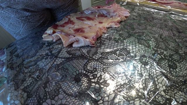 Готовлю рулет из мяса индейки и гуся. Рецепт: на 3 кг мяса - 50 г соли - 2 зубчика чеснока - специи по вкусу - 1,5 стакана бульона.