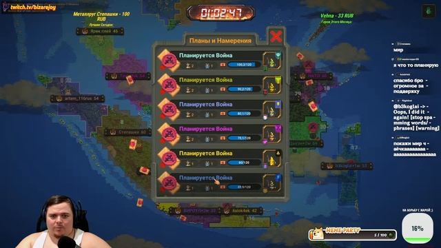 Отправить ДОНАТ Бизарычу - https://www.donationalerts.com/r/bizarre 2 Вариант Отправить ДОНАТИК - https://new.donatepay.ru/@bizarrejoy Заказать МУЗЫКУ на стрим 33р трек 5 мин - https://donatepay.ru/p/bizarrejoy Стрим на VKplay без лагов стрим - https://vkplay.live/bizarrejoy Стрим на ТВИЧЕ тут - https://www.twitch.tv/bizarejoy ТЕЛЕГРАММ канал с чатом Bizarre World - https://t.me/bizarreworld Группа в ВК - https://vk.com/bizarrejoy Ссылка на Правила, таблицу ТУРНИРА 4 сезон - https://clck.ru/3FqBpy Интерактив (ДОНАТ), играем до ТОП 3 вы можете сделать следующее: НОВИНКА Крутануть Колесо ЗАДАНИЙ куча всего интересного - 30р ЗАСЕЛИТЬ СВОЮ СТРАНУ (ТОЛЬКО 1 Страна может быть куплена) ИНТЕРАКТИВ ОБНОВЛЕН, ЛЮДЕЙ ПОКУПАТЬ НЕЛЬЗЯ: Начальное БЕЗРАБОТНЫЙ дает Кофе, без имени, места, х10 чел - 30р Обычное РАБОТЯГА дает бодрящий Кофе, х1 Мир, х15 чел - 50р Бизнесмен ТОРГАШ дает Кофе х2 мир, х30 чел - 100р Богатый ОЛИГАРХ дает Благ и Кофе, х4 мира, х60 чел - 300р Мировая ЭЛИТА дает ВСЕ Бафы, х6 мир, х100 чел - 500р Космос МАСОНЫ дает ВСЕ бафы, х10 мир, х200 чел, отдельный остров - 1000р (Бесплатно из чата селю с 3-4 жителями рандомно после интерактива) ПЕРСОНАЖИ И ГОРОДА Назвать КОРОЛЯ вашим ИМЕНЕМ (без 18+ слов, ок?) - 20р Название Деревни вашим именем (деревня в племени) - 25р Сменить НАЗВАНИЕ своей страны, без мата - 26р БИОМ любой Трава, Джунгли, Лимоны, Конфеты, Алмазы - 41р Сменить название КЛАНА (Альянса) без мата - 51р Добавление скиллов, вещей и атрибутов Королю -Дать КОРОЛЮ способность (какая доступна) (1шт) - 10р (Бессмертие, Гигант, Сила, Мудрость, Гениальность, Регенерация и т.д.) ПОЛИТИКА (передача миров теперь 2к1) Объявление МИРА или ВОЙНЫ стране (ваша страна) - 80р Объявить МИР или ВОЙНУ между чужими странами - 150р Выбрать ЭПОХУ любую на ваш выбор, будьте осторожны - 101р Развалить АЛЬЯНС с союзными странами (свой) - 130р Развалить АЛЬЯНС с союзными странами (любой чужой) - 260р СВОБОДА (до топ 10) Восстание СТРАНЫ обретает свободу (страна_Х захваченная) - 499р (до топ 6 действие, ваше поселение на карте и название+мир) ПОМОЧЬ ПОСЕЛЕНЦАМ РЕСУРСАМИ (дают баф к развитию) Дать КАМЕНЬ, ЗОЛОТО, РУДА, АДАМАНТИЙ, СЕРЕБРО, МИФРИЛ - х1шт = 1р НАВРЕДИТЬ ПОСЕЛЕНЦАМ (после перемирия 30 минутного) Наслать МАГА-ЗЛА пускает огонь на жителей x1 - 100р Наслать НЕКРОМАНТА плодит скелетов х1 - 40р Наслать ДЕМОНА сильный монстр огневой х1 - 60р Атака животных Медведи, Волки, Носороги х1 - 25р Послать злых Бандитов, Холодоков, Снеговиков х1 - 50р ЧУДЕСА ДОБРЫЕ Дать КОФЕ ( +СКОРОСТЬ) !страна! КРОМЕ ВОЙНЫ и 10м ПЕРЕМИРИЯ - 25р Послать БЛАГОСЛОВЛЕНИЕ (дает СИЛУ) !вся страна! - 100р Наложить МОЩНОСИЛ на свою провку, сила Армии! МОщный БАФ - 100р Дать деревне ДРУИДА х5 защищает жителей, реген растений - 33р Дать жителям ДОБРОГО МАГА х3 защищает от ЗЛА (кроме Орков) - 50р Чумной ДОКТОР лечил БОЛЕЗНИ и ЗОМБИ ВИРУС - 55р Божественный ШАР защита всех жителей от урона (временно) - 60р Послать ЧУДО (ЛЕЧИТ - безумие, инфекции, болезни) !вся страна! - 154р ☔ ЧУДЕСА ЗЛЫЕ (после перемирия 30 минутного) ☔ Оживить ДЕРЕВЬЯ или ДОМА вредят людям !3-ая кисть! - 80р Удар МОЛНИИ ЗЕВСА все поджигает в месте удара - 90р Послать ТОРНАДО на деревню указать, все разрушает - 100р Наложить ПРОКЛЯТЬЕ на жителей (делает СЛАБЫМИ) - 111р Поставить ОГНЕННУЮ БАШНЮ сжигает все вокруг - 120р Поставить ЛЕДЯНУЮ БАШНЮ всех замораживает - 120р Наслать СУПЕР ТЫКВА плодит тыквы и очень Агрессивна - 122р АПОКАЛИПСИС (после перемирия 30 минутного) ГРАНАТА кинуть куда либо (кроме армии врага это читерно) - 35р Отправить НЛО в деревню указать какую - 170р Наслать ЗЕМЛ