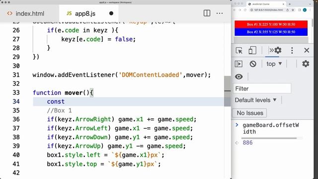 Learn JavaScript FULL Course 9 hours+ lifetime access HD videos https://www.udemy.com/course/javascript-mini-projects/ JavaScript Projects JS Dynamic interactive DOM elements Perfect to practice and learn more about JavaScript and DOM interactions create useful components and more JavaScript DOM element Collision detection How to check for overlap between Page elements The overlap of elements is what can be referred to as collision detection. This is a standard part of most games, when moving page elements to be able to detect the position and calculate if they are overlapping. This exercise is designed to test and learn more about how to check for overlap of elements that move on the page. It will demonstrate how to set up movement of page elements, and output the values needed to calculate the collision between two page elements. Set up movement of page elements and track the position exercise : 1. Create a function that allows for the creation of page elements as we can then dynamically add elements to the page as needed. Give the function a name of adder() to get the parent element that the new element will be appended to. Create the element using the string value of the element tag. Add the inner HTML content for the element and also add a class using the string value. 2. Create 4 page elements, 2 boxes that will be moved, and 2 areas to output the box coordinates and dimensions. 3. Create a global game object that can track the animation frame, contains the x,y (horizontal,vertical) position of each box, and that contains the h,w (height and width) of each box. These values then can be used to update the position. 4. Set up an object named keyz to track which keyboard keys will be used for element movement. Add 8 key code names as property names and set the values to false. This will be updated once the key is pressed. 5. Add event listeners on the document that listen for keydown and keyup events. If the keys from the keyz object pressed match the object property name, set the value to true on press down and false on up. This can now be used for the element movement. 6. Create and Launch the mover() function which will handle page element movement on key presses. 7. Within the mover() function add conditions to check which keys are true, update the game object x,y for each box accordingly. Also apply a condition to check to ensure that before the movement is allowed that the element is within the boundaries of the main container object element. 8. Update the style values of properties left and top for each box with the new game x,y values for each. 9. Output the x,y,h,w of each element to the page as they move; these values should change with the new x,y coordinates of the element. These will be used to calculate the collision of the elements. Collision detection Checker of DOM page elements Part 2 Source Code Collision detection with JavaScript DOM elements example To check if any two elements are overlapping you need both element, x,y height and width values. These can then be used to calculate the corners to see overlap on the horizontal axis and overlap on the vertical axis. If both horizontal and vertical are overlapping then there is a collision occurring between the two elements on the page. Using getBoundingClientRect() will return the dimension of an element. This method returns an object of values which properties include, bottom, height, left, right, top, width, x, y These values for the element can then be used in the collision formula to check for overlap. Moving exercise to check for element overlap: 1. create move output areas to show the current stats of the element and the collision values. Update the style of the element if an overlap occurs. 2. Create a new element in the center to use within the collision check function. 3. Create a new function that requires two parameters, one for each element to check. Get the boundaries of the element. 4. Create a function col() which can check the boundaries and return a boolean value if the two elements are overlapping. Use this formula to check for overlap of the elements between the various boxes on the screen. 5. Update element styling and output info styling depending on the result of the collision detection. Course content web development and web design courses with coding examples and source code for the lesson content. Source Code is available within my Github account. Lessons posted are designed to help students learn more about a specific topic related to modern web development and applying code. Laurence Svekis is a professional top selling course author having instructed over 1 Million students both online and in person. Laurence Svekis is a Google Developer Expert specializing in Google Workspace automation using Google Apps Script Code. Check out my Website for more details at https://basescripts.com/ Subscribe - https://www.youtube.com/@LaurenceSvek... #AppsScript #googlesheets #workspace #tips