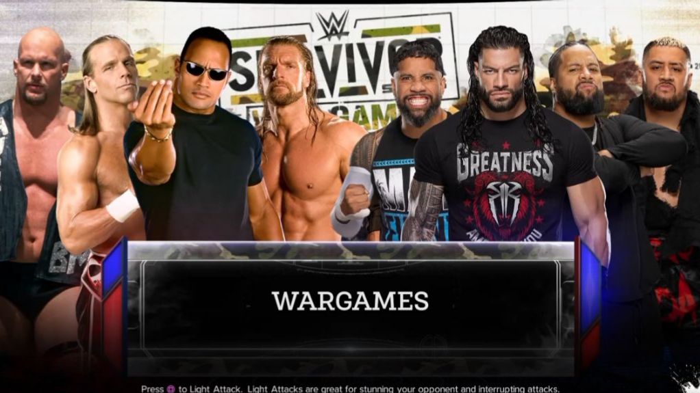 WWE 2K24 Wargames The Rock HHH HBK Stone Cold vs Roman Reigns Jey Uso Jimmy Uso Solo Sikoa